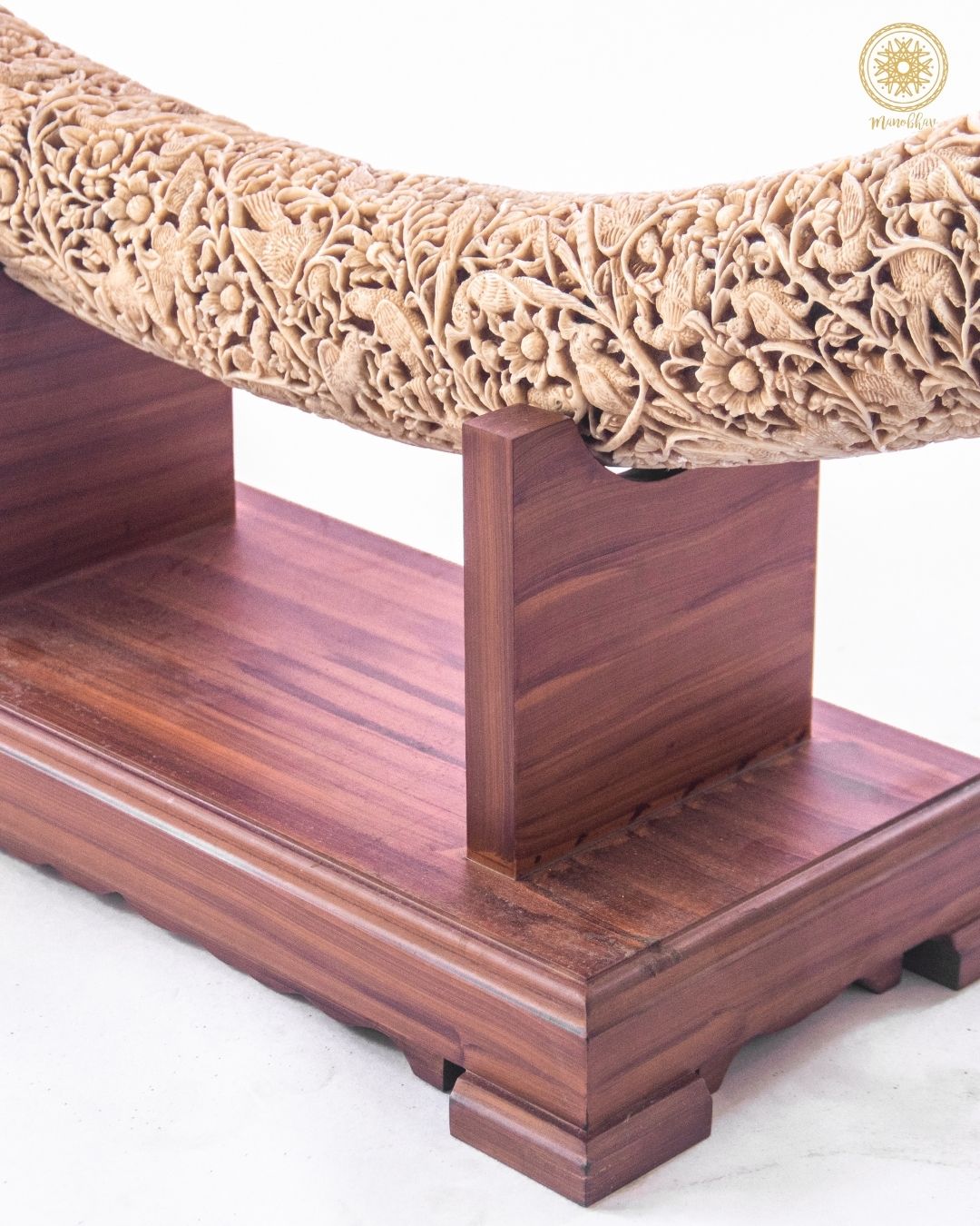 - Der Stoßzahn ist auf einem Holzsockel montiert, der ihm Stabilität verleiht und das Prachtstück erhöht.