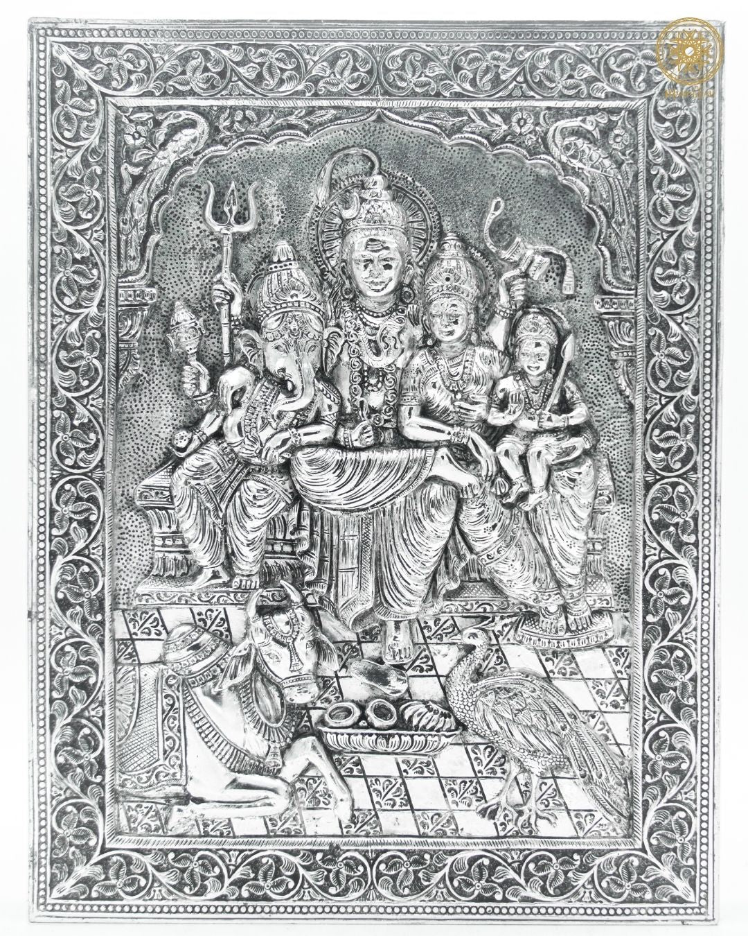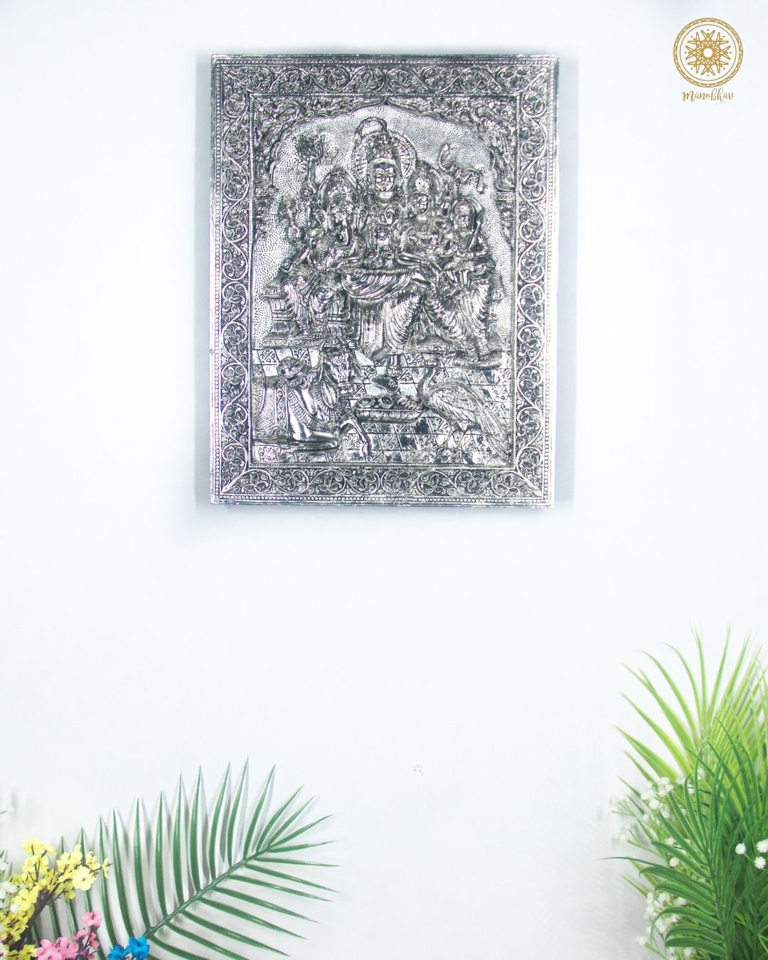 Kaufen Sie einen handgeschnitzten, versilberten Shiv Parivar-Wandrahmen für Zuhause und das Büro.