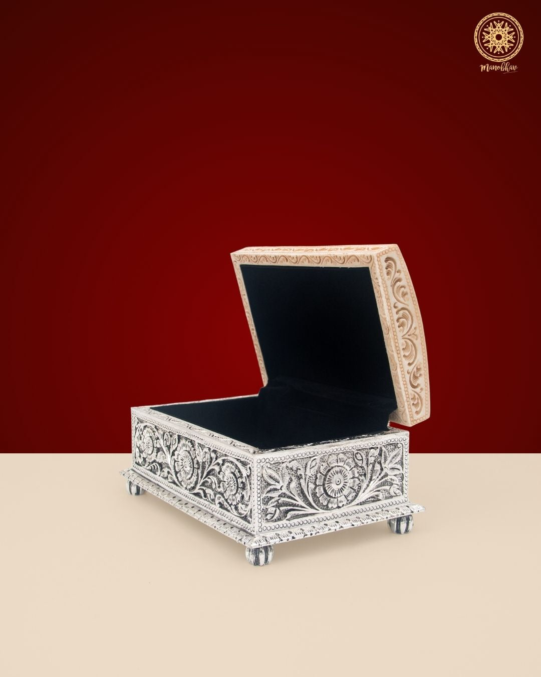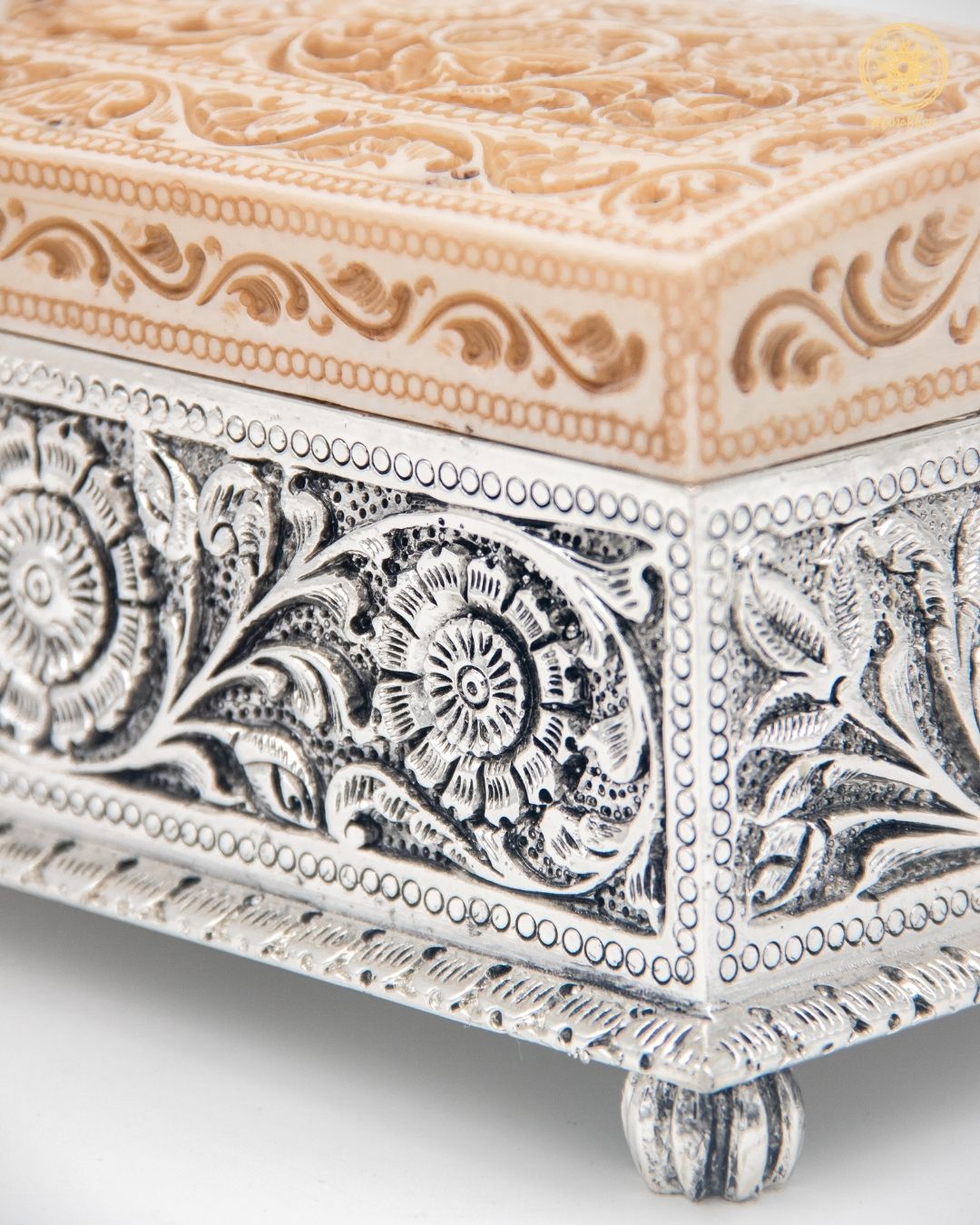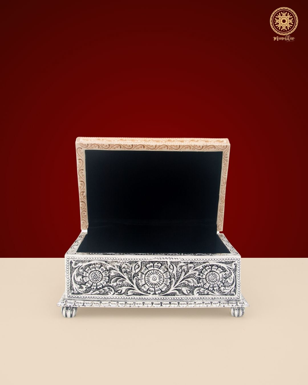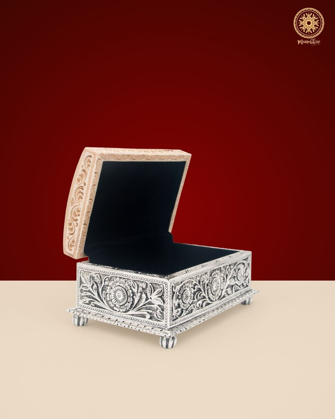 This vintage jewelry box with 3D flower patterns combines classic design with modern craftsmanship. Made with high-quality resin with silver-plating. The box features intricate carvings that provide the box with an antique touch, making it an ideal jewelry case for safekeeping your beloved jewelry. Be it a jewelry box of functional use or merely a showpiece, this one represent an aura of luxury. It can be used as an earring box and a jewelry chest as it is capable of holding earrings, necklaces and rings in perfect condition. The best jewelry box that every collector can ever have as it fuses beauty and practicality. This box brings luxury to any room and is ideal for any pedestal. Storage is just an overstatement. It can be considered decorative.