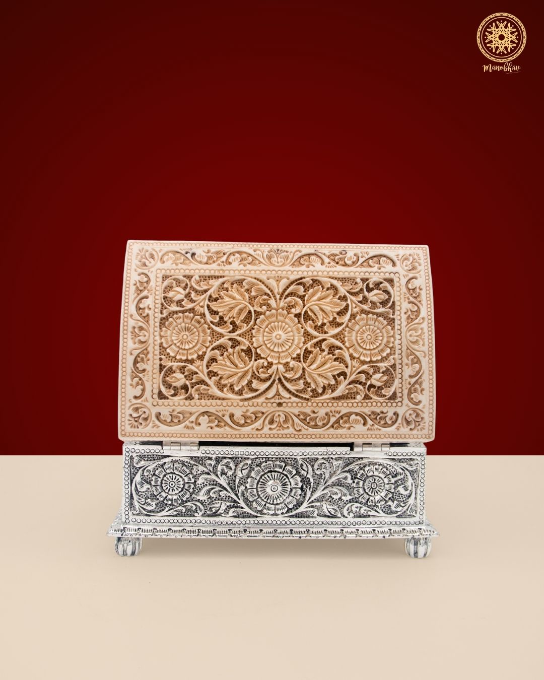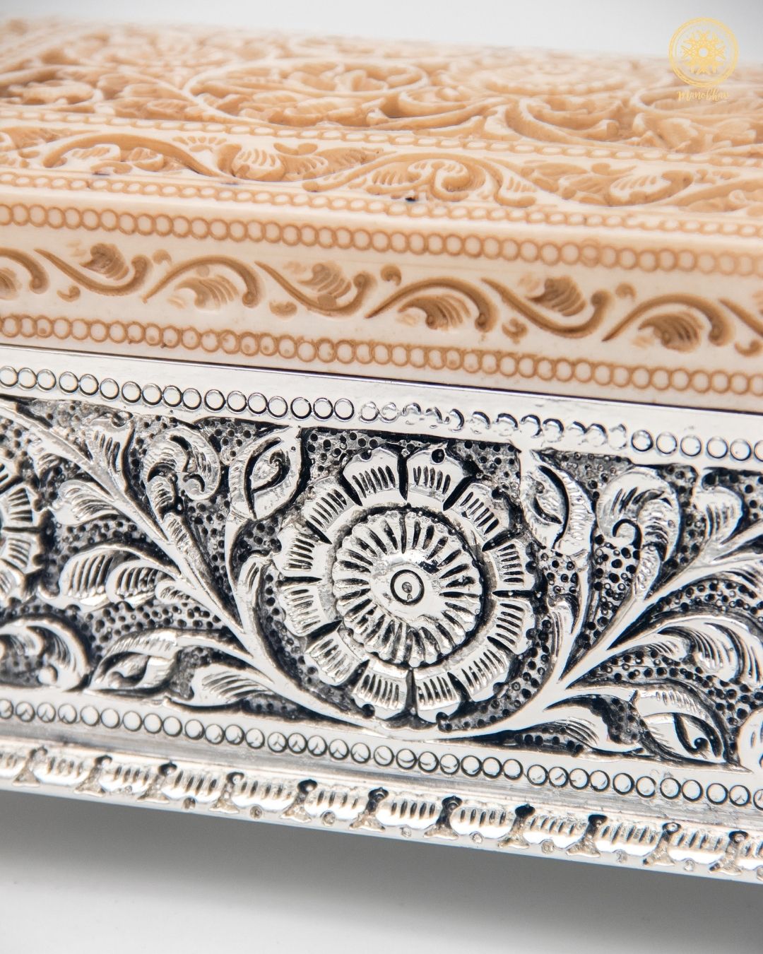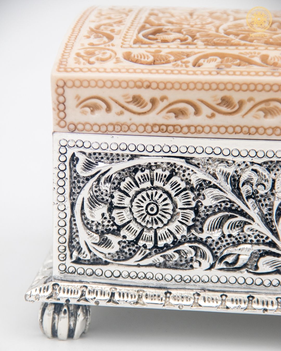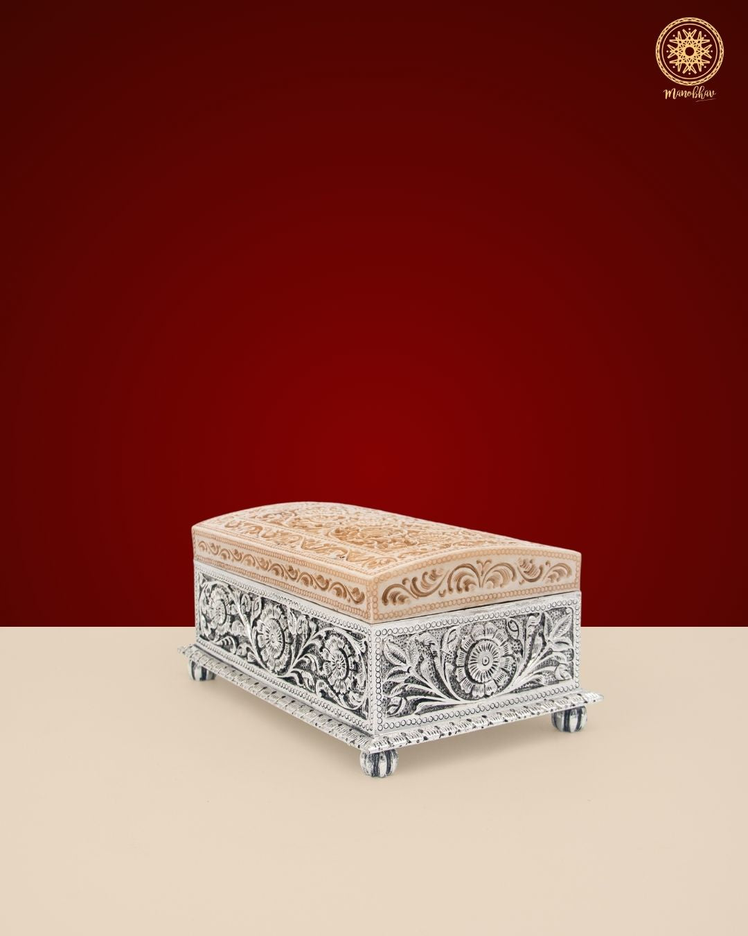 This vintage jewelry box with 3D flower patterns combines classic design with modern craftsmanship. Made with high-quality resin with silver-plating. The box features intricate carvings that provide the box with an antique touch, making it an ideal jewelry case for safekeeping your beloved jewelry. Be it a jewelry box of functional use or merely a showpiece, this one represent an aura of luxury. It can be used as an earring box and a jewelry chest as it is capable of holding earrings, necklaces and rings in perfect condition. The best jewelry box that every collector can ever have as it fuses beauty and practicality. This box brings luxury to any room and is ideal for any pedestal. Storage is just an overstatement. It can be considered decorative.