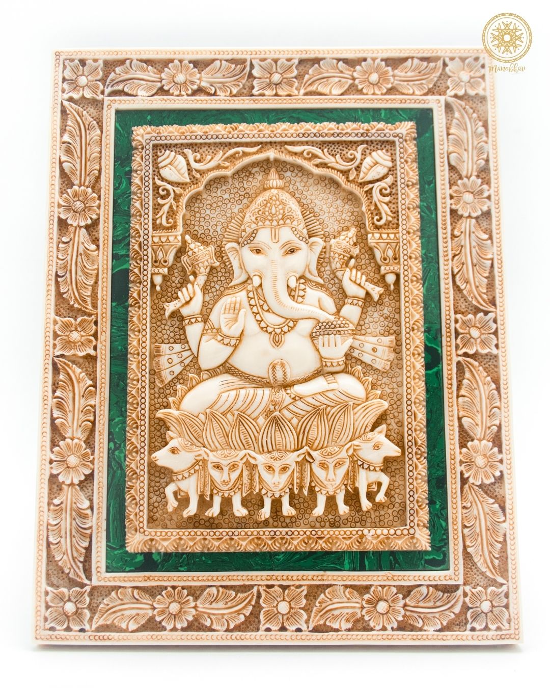 Ce cadre mural représentant Ganesh représente des sculptures complexes avec une finition antique qui imite parfaitement l'apparence de l'ivoire véritable. De plus, orné d'incrustations de malachite, ce cadre Ganpati représente le Seigneur Ganesh, la divinité de la sagesse et de l'élimination des obstacles.