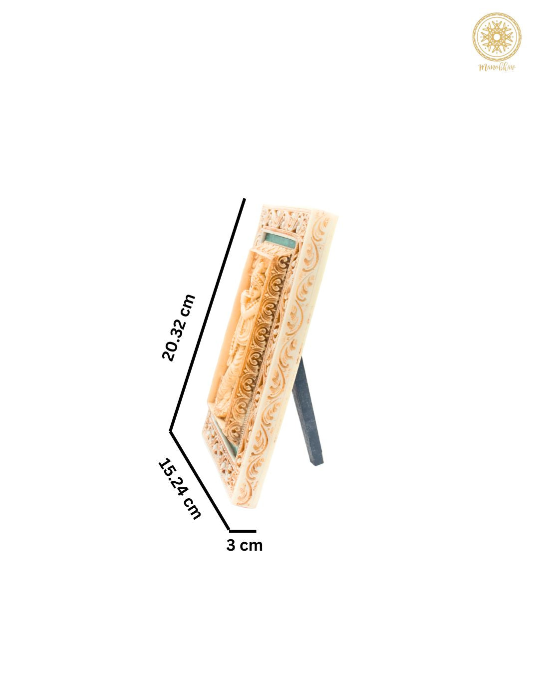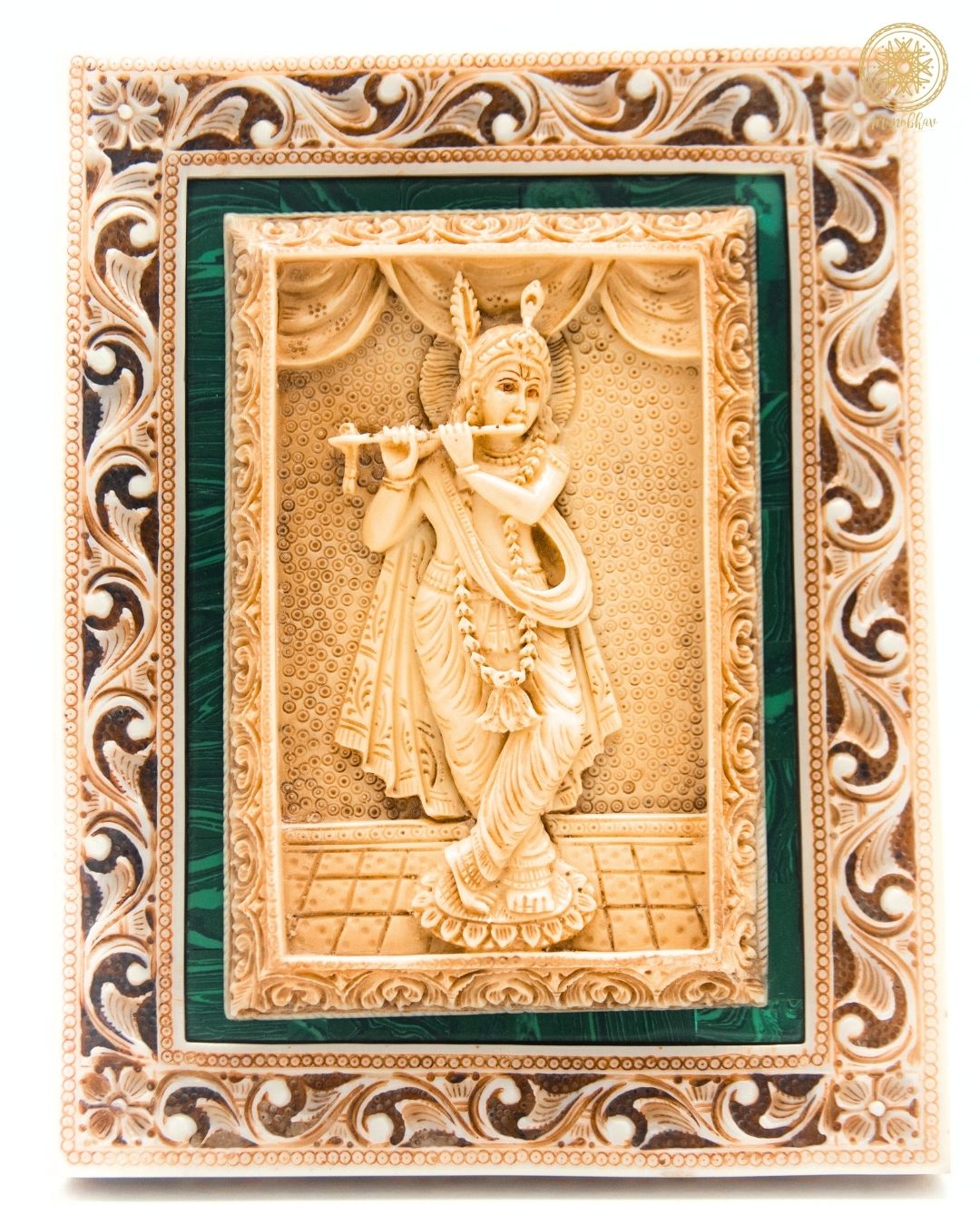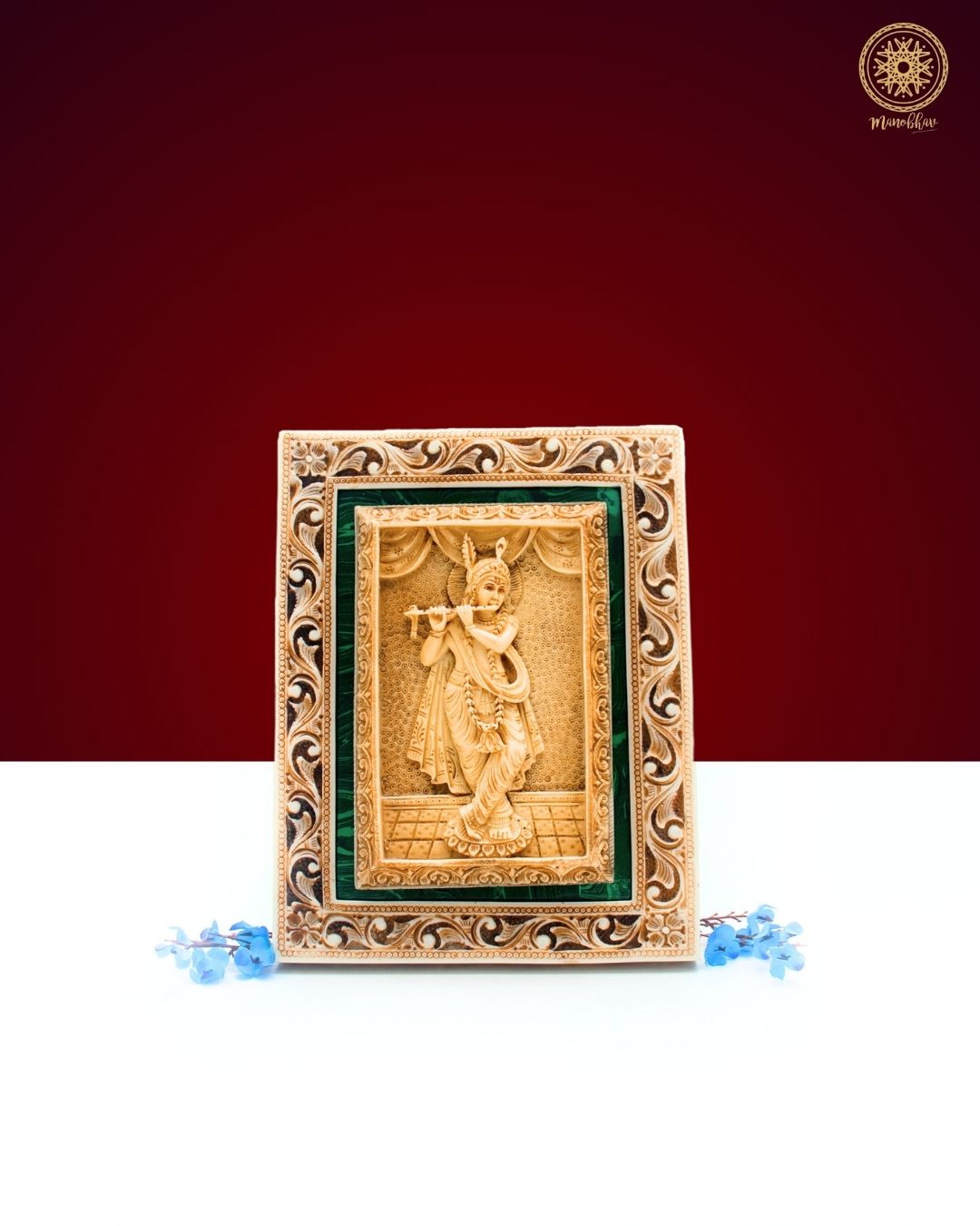 Cette tenture murale du Seigneur Krishna avec incrustation de malachite apporte une touche de maîtrise spirituelle à n'importe quel espace. Les sculptures complexes et la finition riche capturent l'essence du Seigneur, apportant paix, protection et prospérité dans votre maison. Un ajout parfait à vos cadres muraux de galerie, ajoutant spiritualité et raffinement.