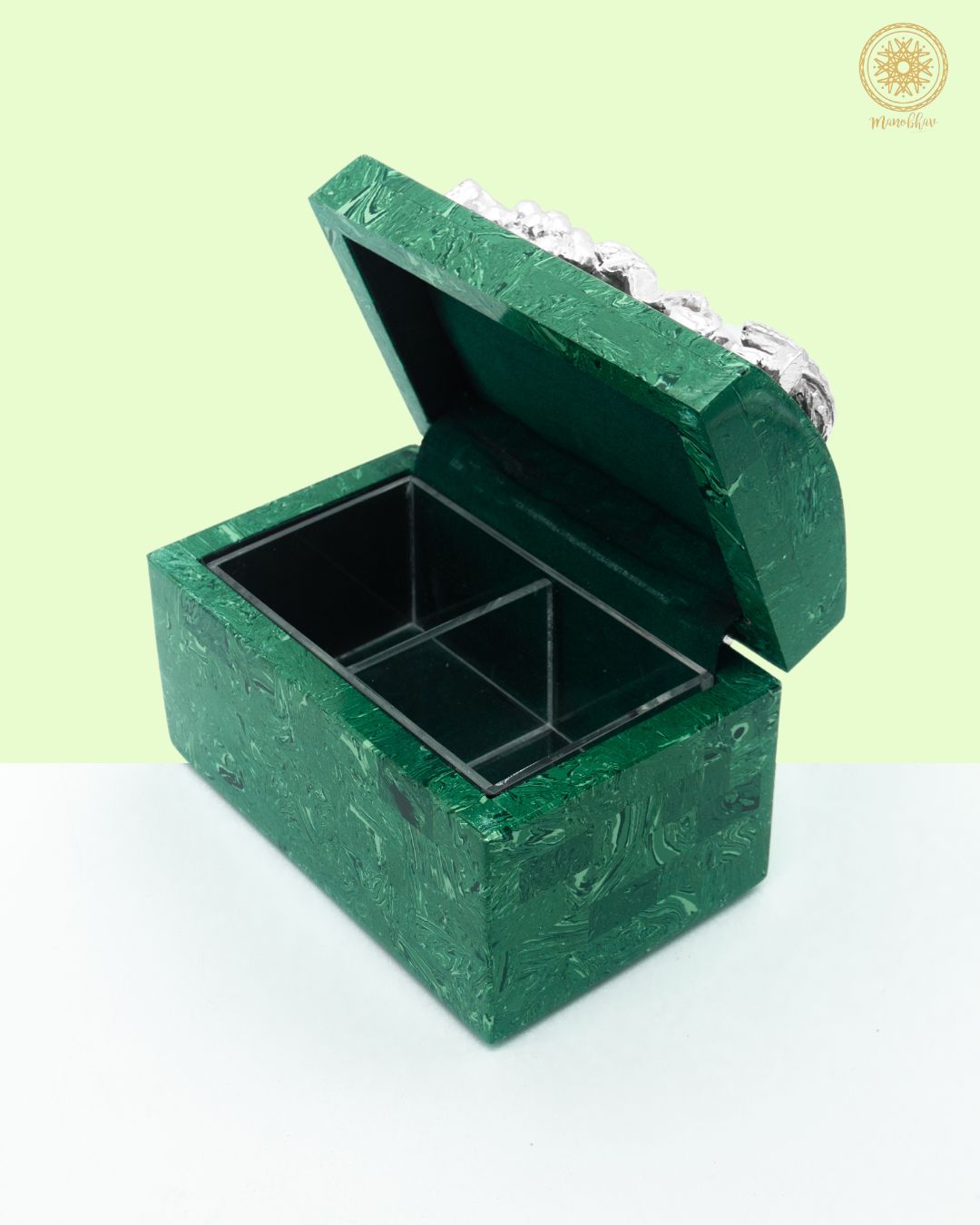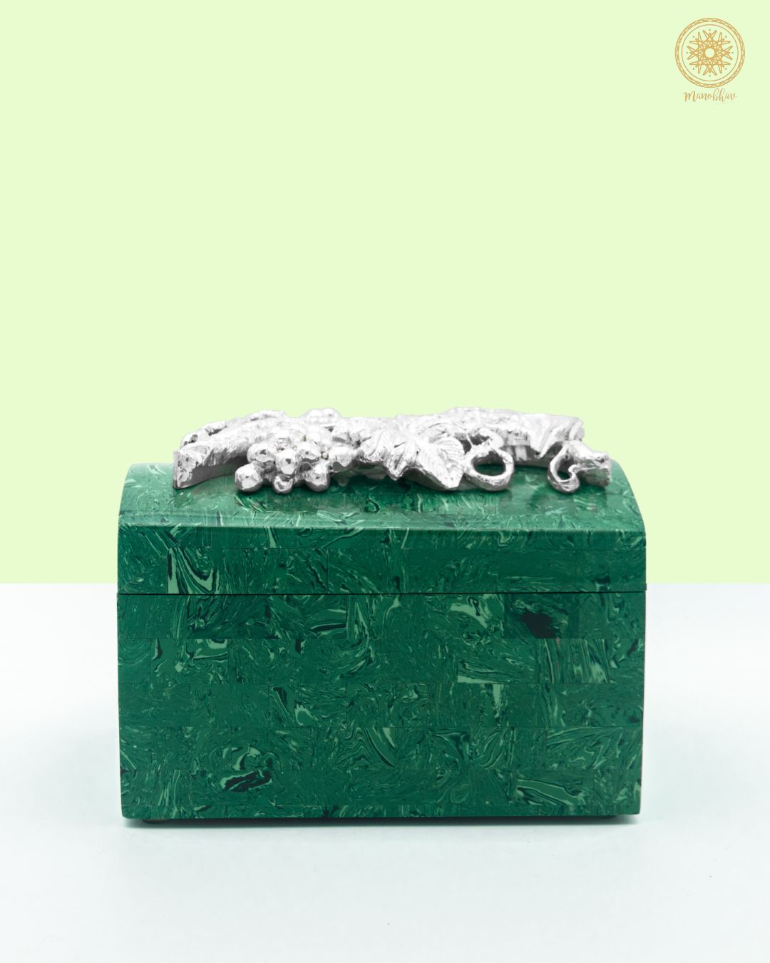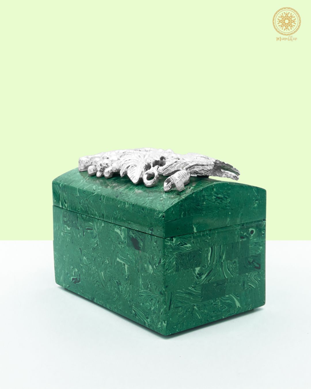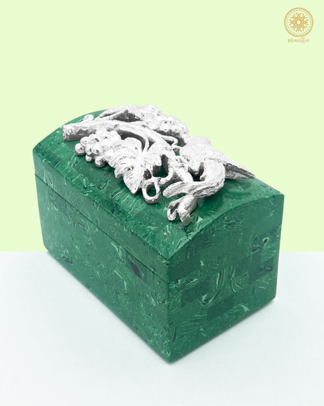 une boîte à bijoux en malachite qui intègre des fleurs et des oiseaux en argent aux côtés de profondeurs vertes méticuleusement façonnées par des mains expérimentées, offrant à la fois un rangement et une représentation ornée.