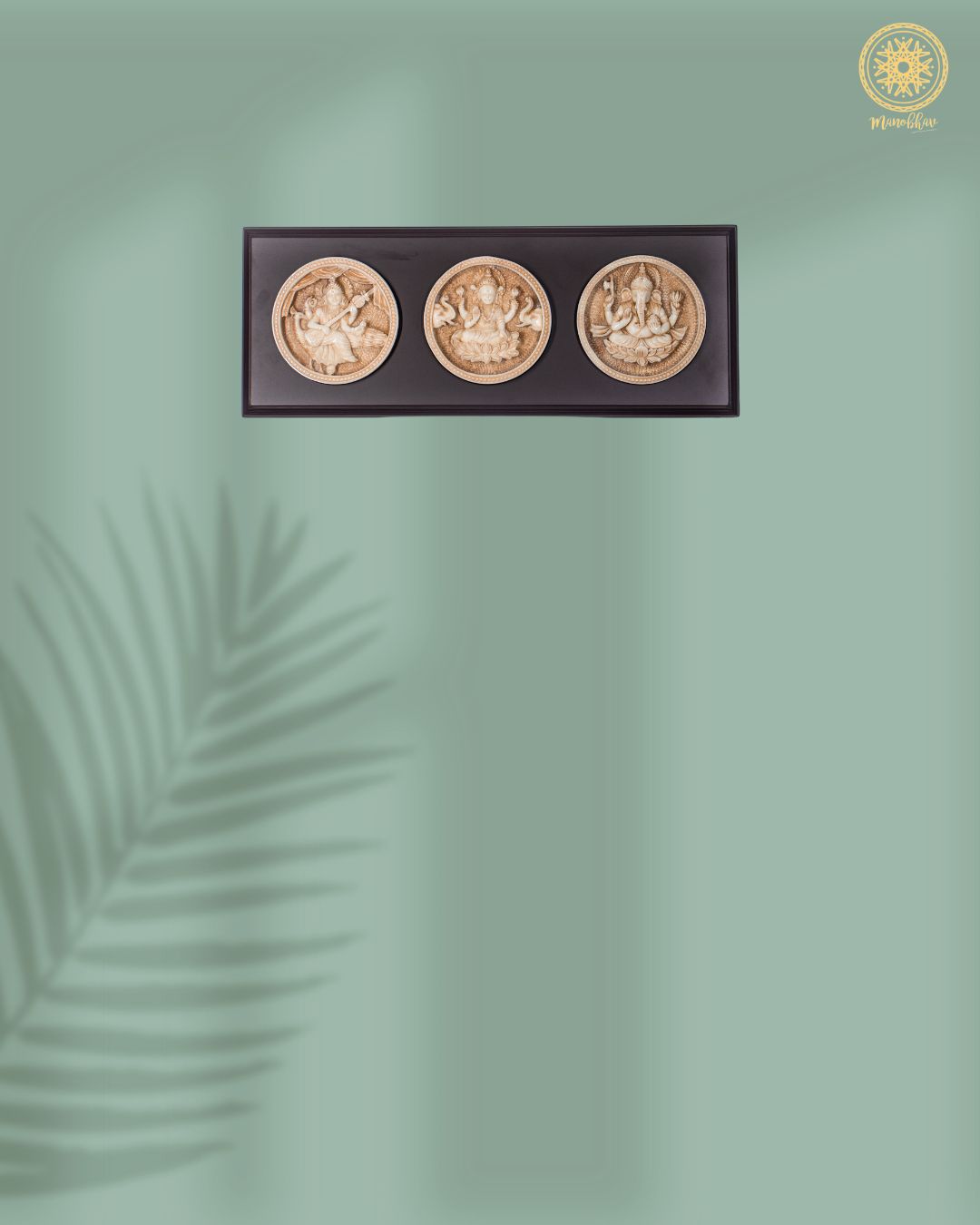 Each deity has a deep significance, the goddess of wisdom and arts, inspires intellect and creativity; Goddess Lakshmi, the goddess of wealth, blesses with prosperity and fortune; and Lord Ganesha, the remover of obstacles, ensures success in all aspect. The intricate resin detailing and premium wooden frame enhance its vintage appeal which makes it both a spiritual and artistic masterpiece.