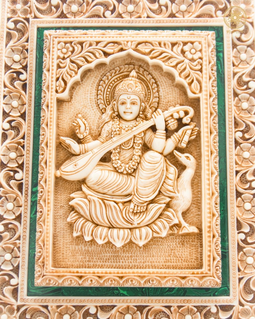 This stunning Goddess Sarasvati wall hanging frame is exquisite in traditional work, with detailed hand carved and luxurious malachite inlay. Diligent hard work has gone into every curve and shape of making this divine Saraswati ji frame. Saraswati ji is known as the goddess of knowledge, music, arts, and is thus a symbol of wisdom, creativity, and spiritual enlightenment. Perfect to decorate Goddess Sarasvati in your house, this wall art decor is ideal for use in your study, living room, or prayer area. Add it to your gallery wall frames and enjoy the space filled with positive energy and beauty. This frame can be a great gift on special occasions such as housewarmings, festivals, or religious ceremonies.