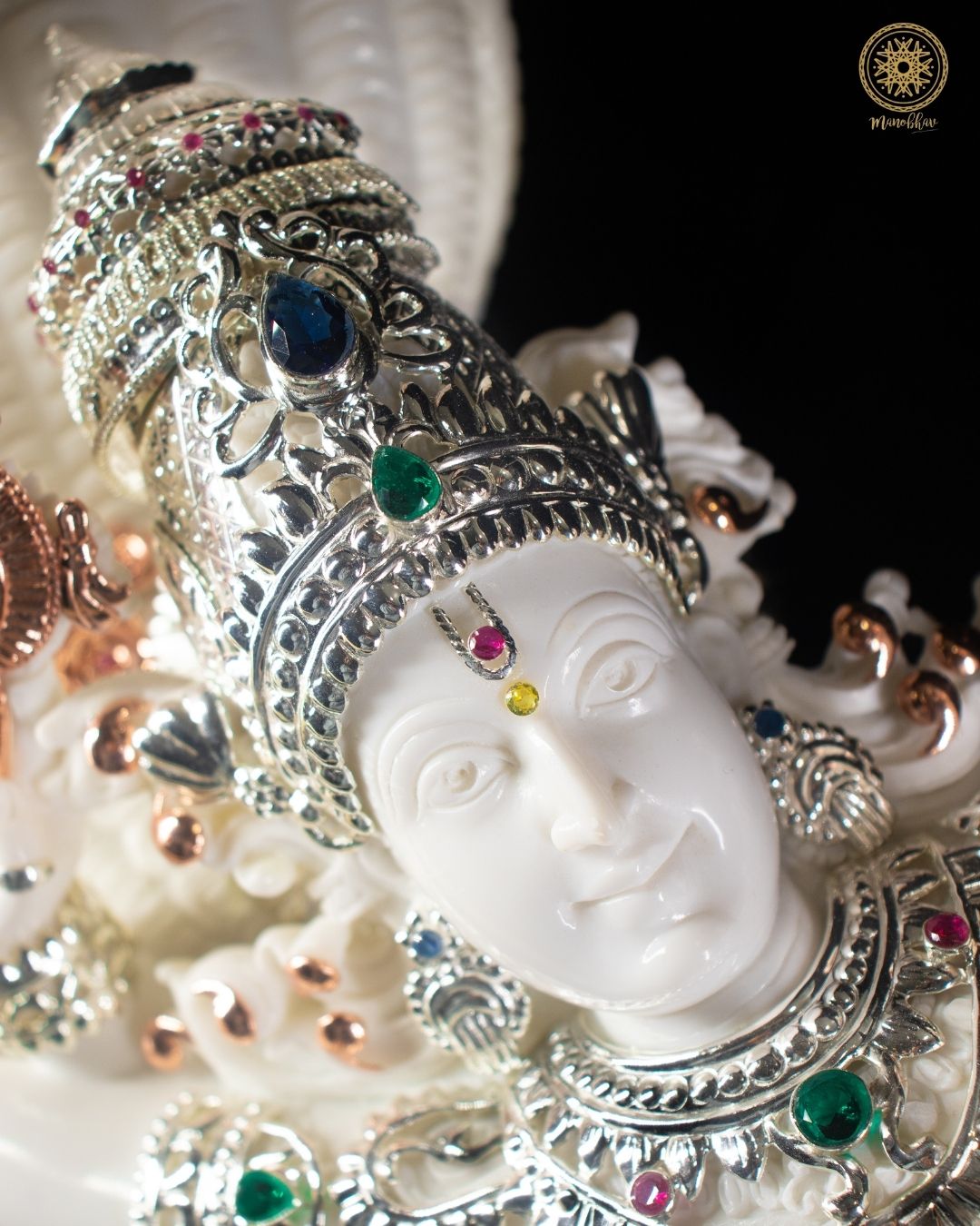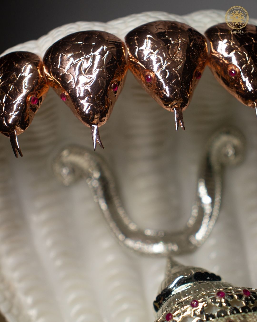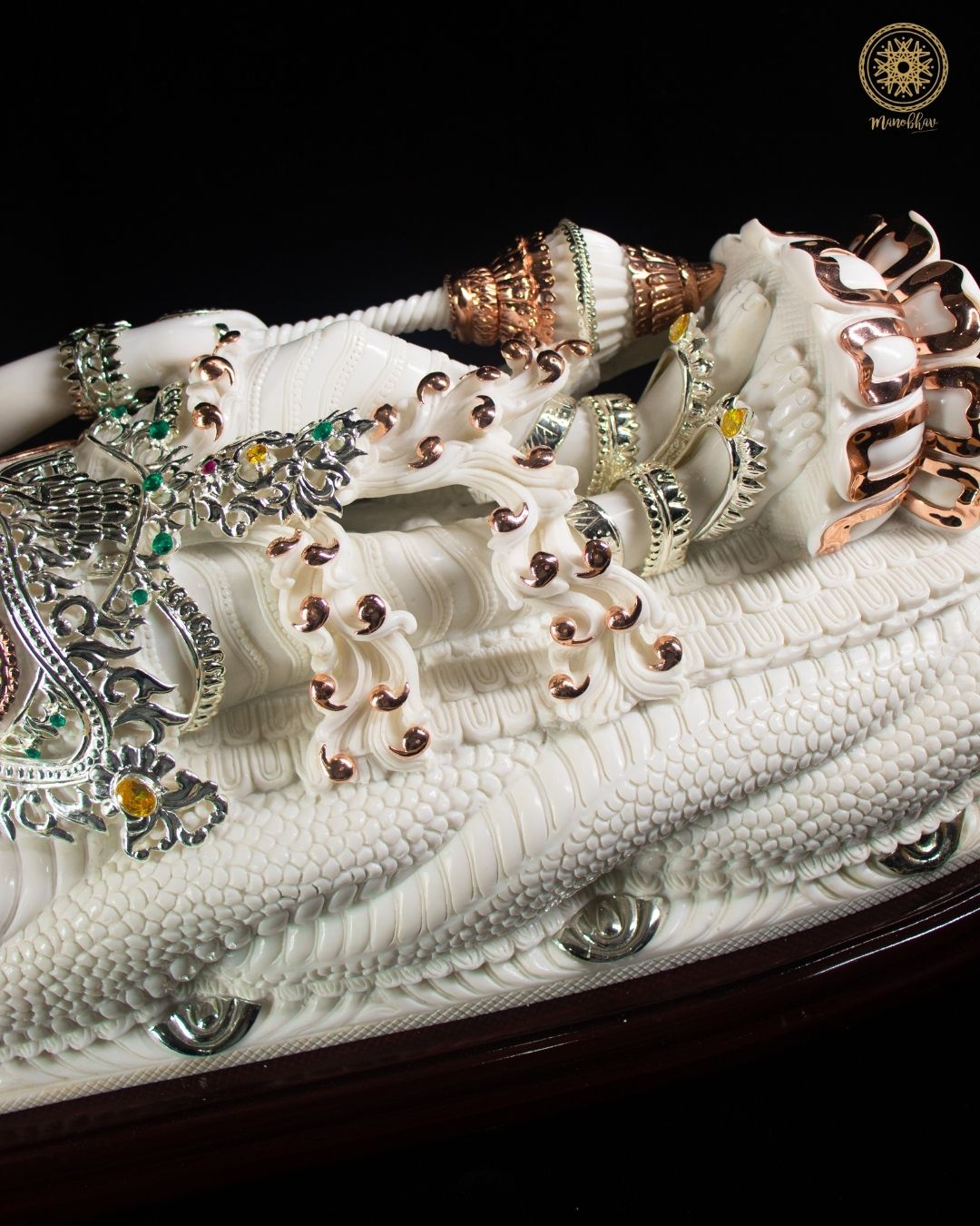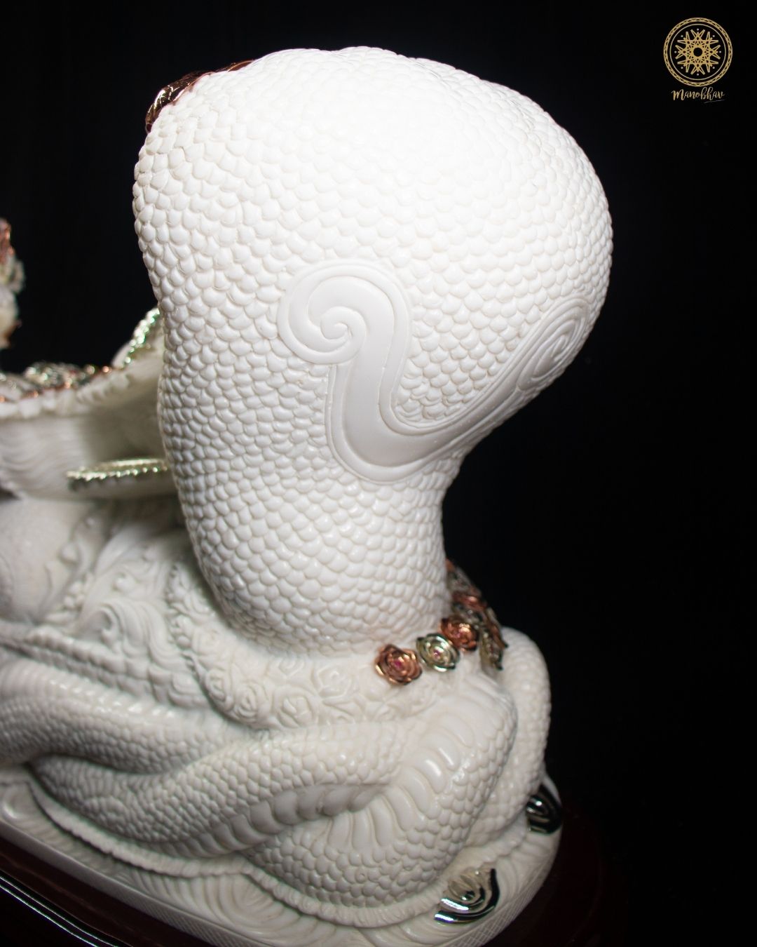 This Hand-Carved Vishnu Ji Sleeping Statue is a beautiful representation of Lord Vishnu in his Sheshashayi form, reclining on the serpent Ananta (Sheshnag). It is crafted from premium marble dust, this antique-style Vishnu idol is adorned with intricately designed metal jewelry which adds a touch of vintage look and divine beauty.