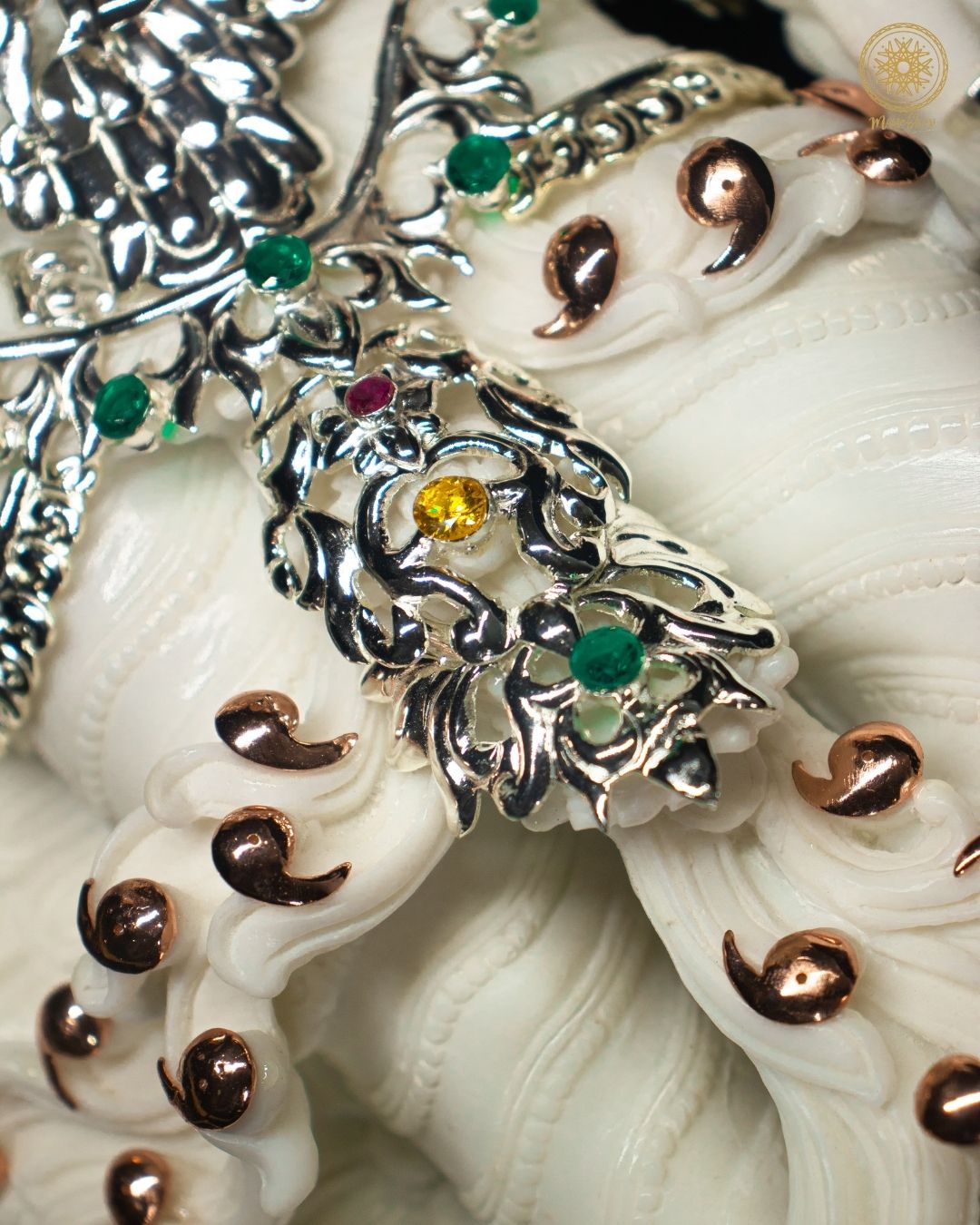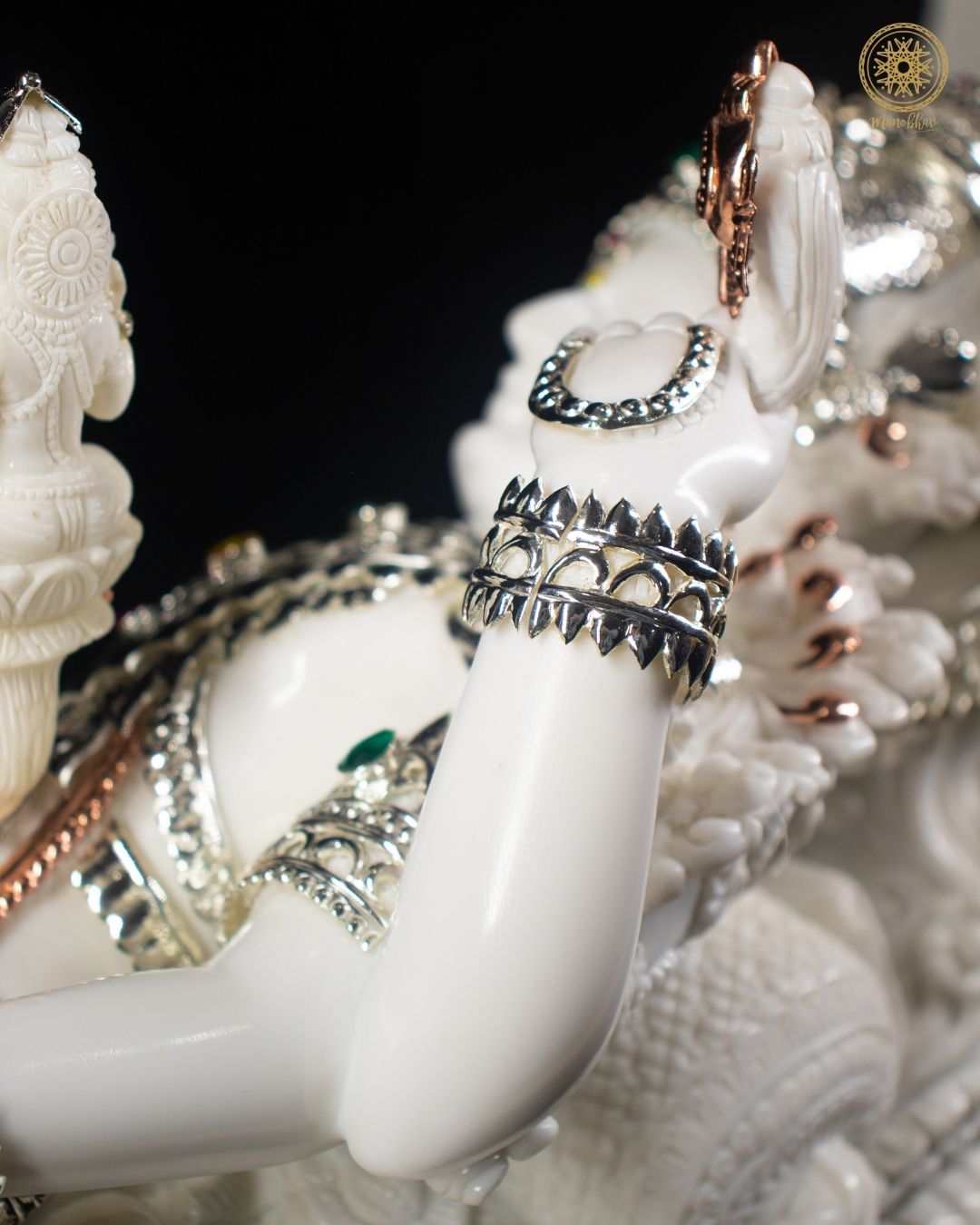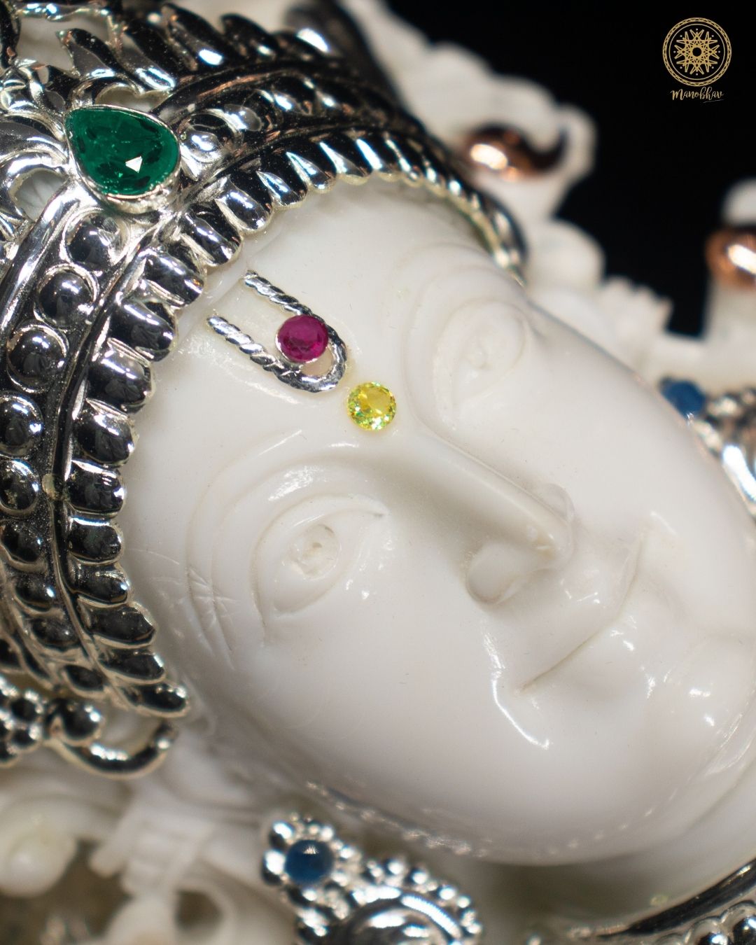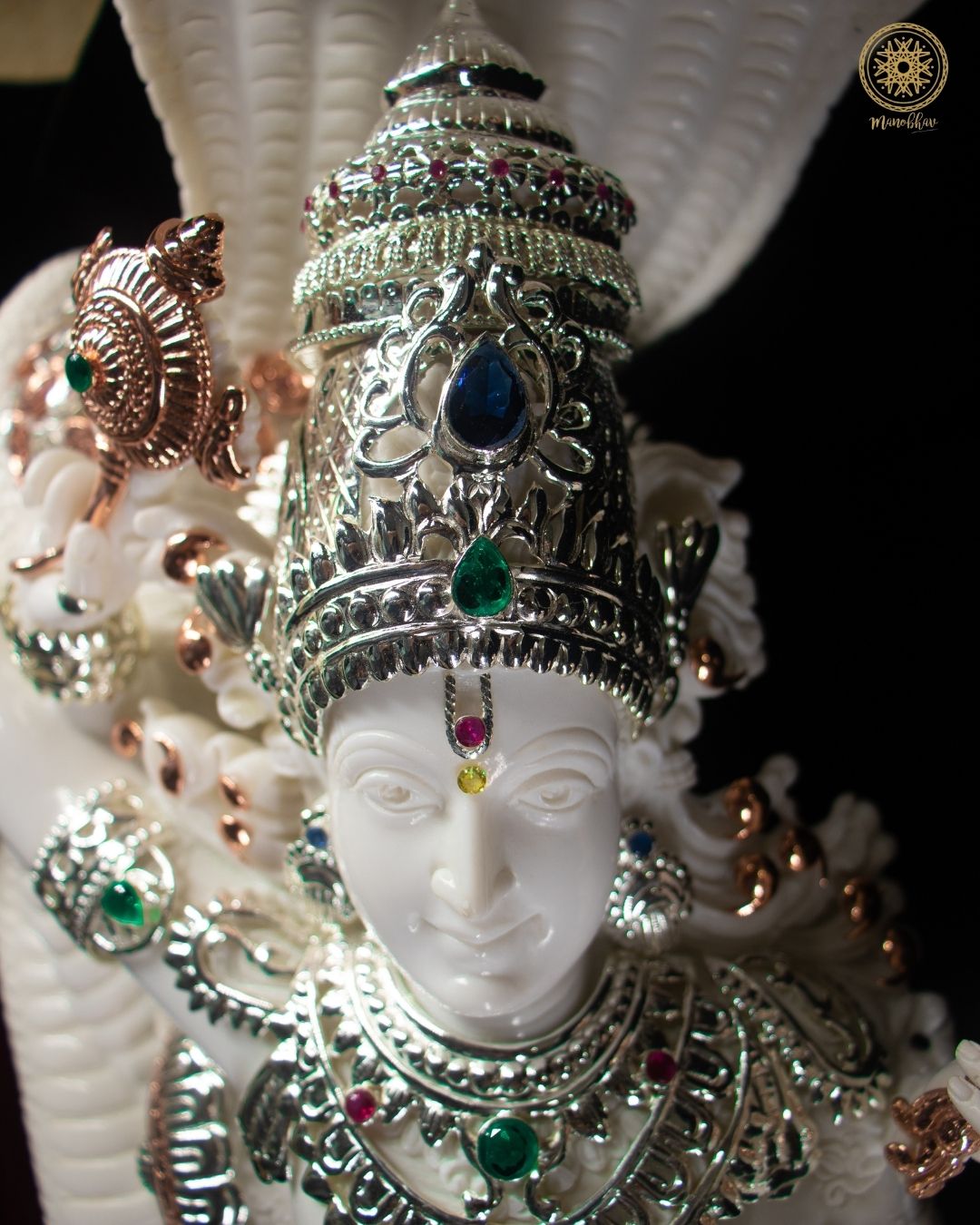 This Hand-Carved Vishnu Ji Sleeping Statue is a beautiful representation of Lord Vishnu in his Sheshashayi form, reclining on the serpent Ananta (Sheshnag). It is crafted from premium marble dust, this antique-style Vishnu idol is adorned with intricately designed metal jewelry which adds a touch of vintage look and divine beauty.