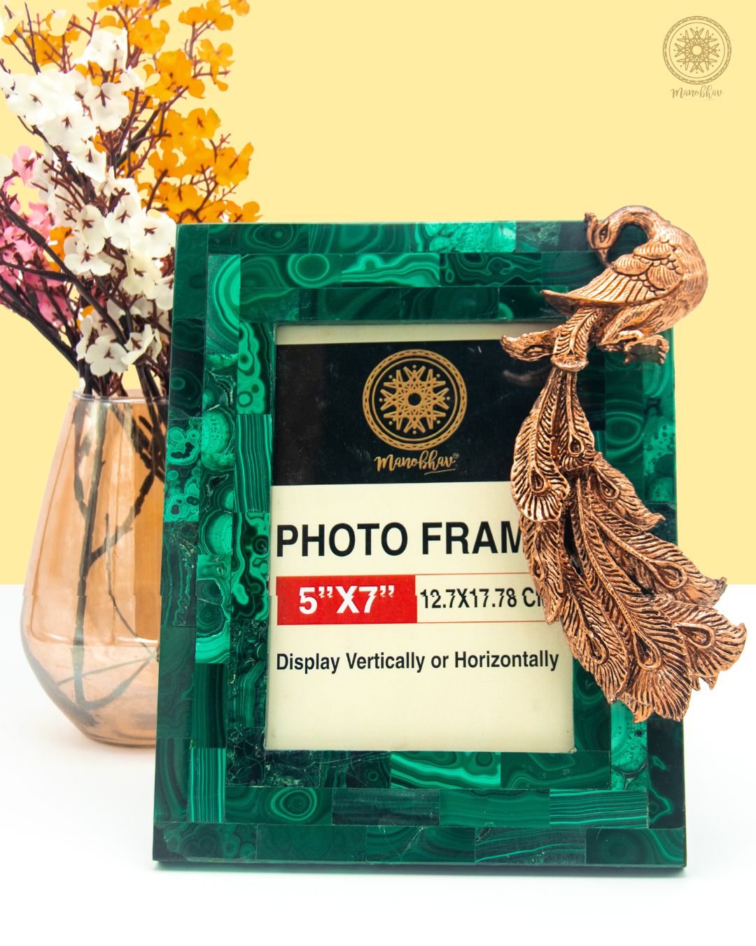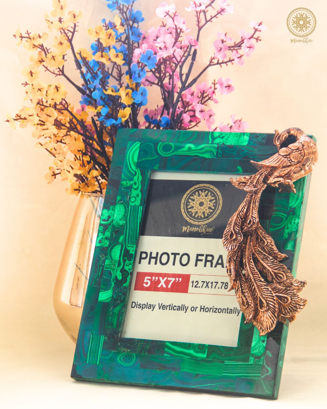 Enjoy the luxurious elegance of our natural malachite photo frame, which is a blend of nature's beauty as well as handcrafted art. It has a delicate rose gold peacock that is perfect for 5"x7" photos displayed either vertically or horizontally in it. Enhance your decor with this eternal piece.
