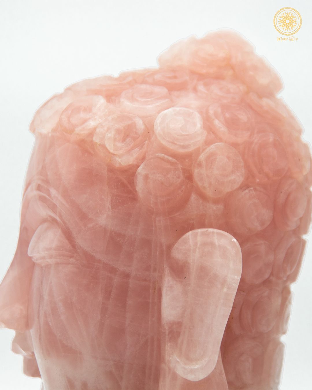 This beautiful statue is designed and constructed by a talented artist, thus none is identical to the other. The intricate detailing brings The Buddha's face into focus, with the expression representing peace and mindfulness. In Feng Shui, the rose quartz Buddha statue is commonly used since it embodies love, healing and promotes harmony in the space.