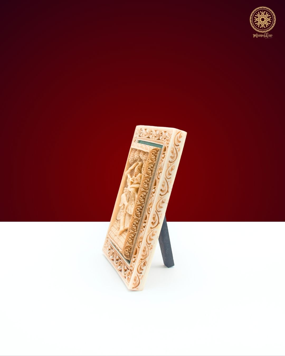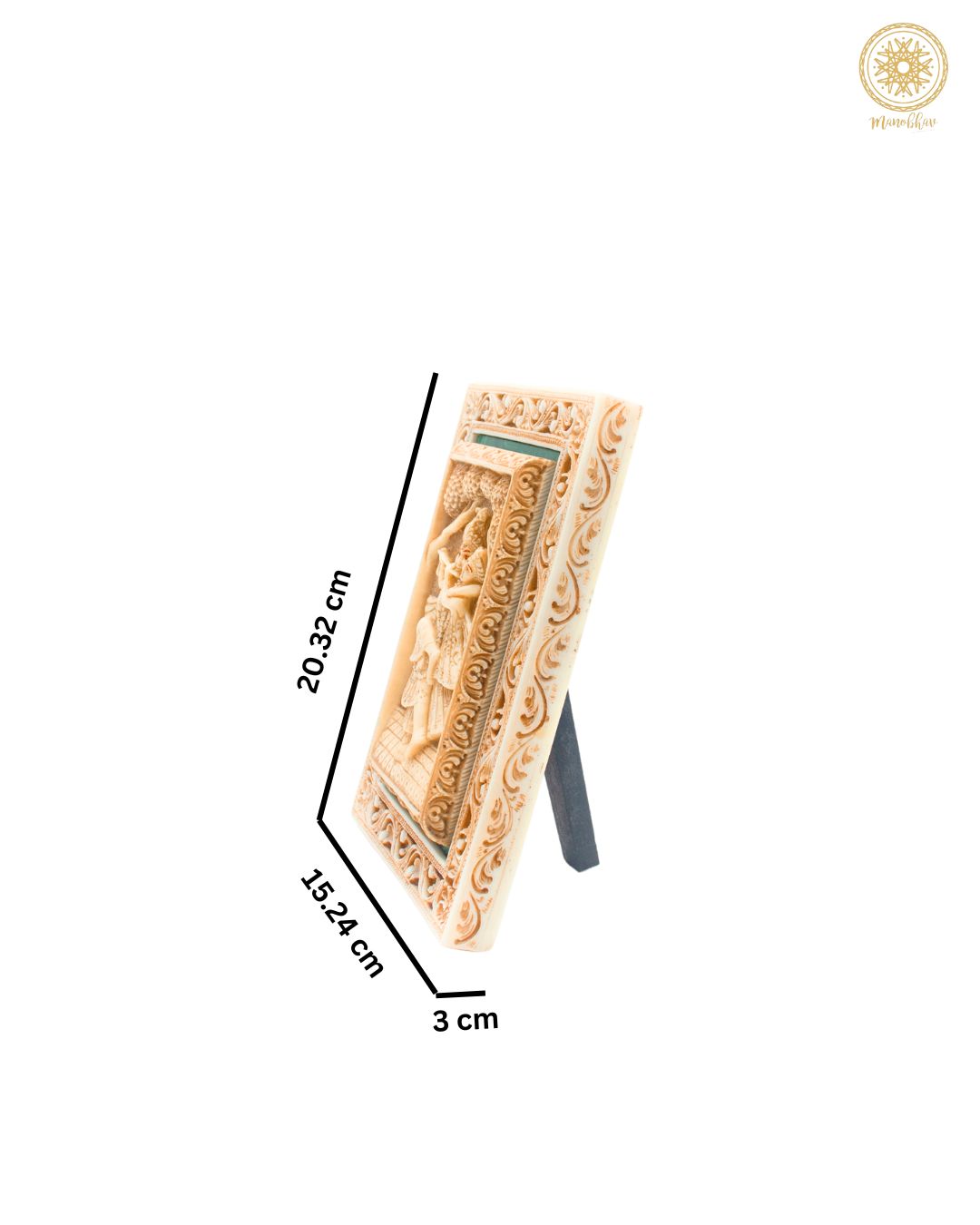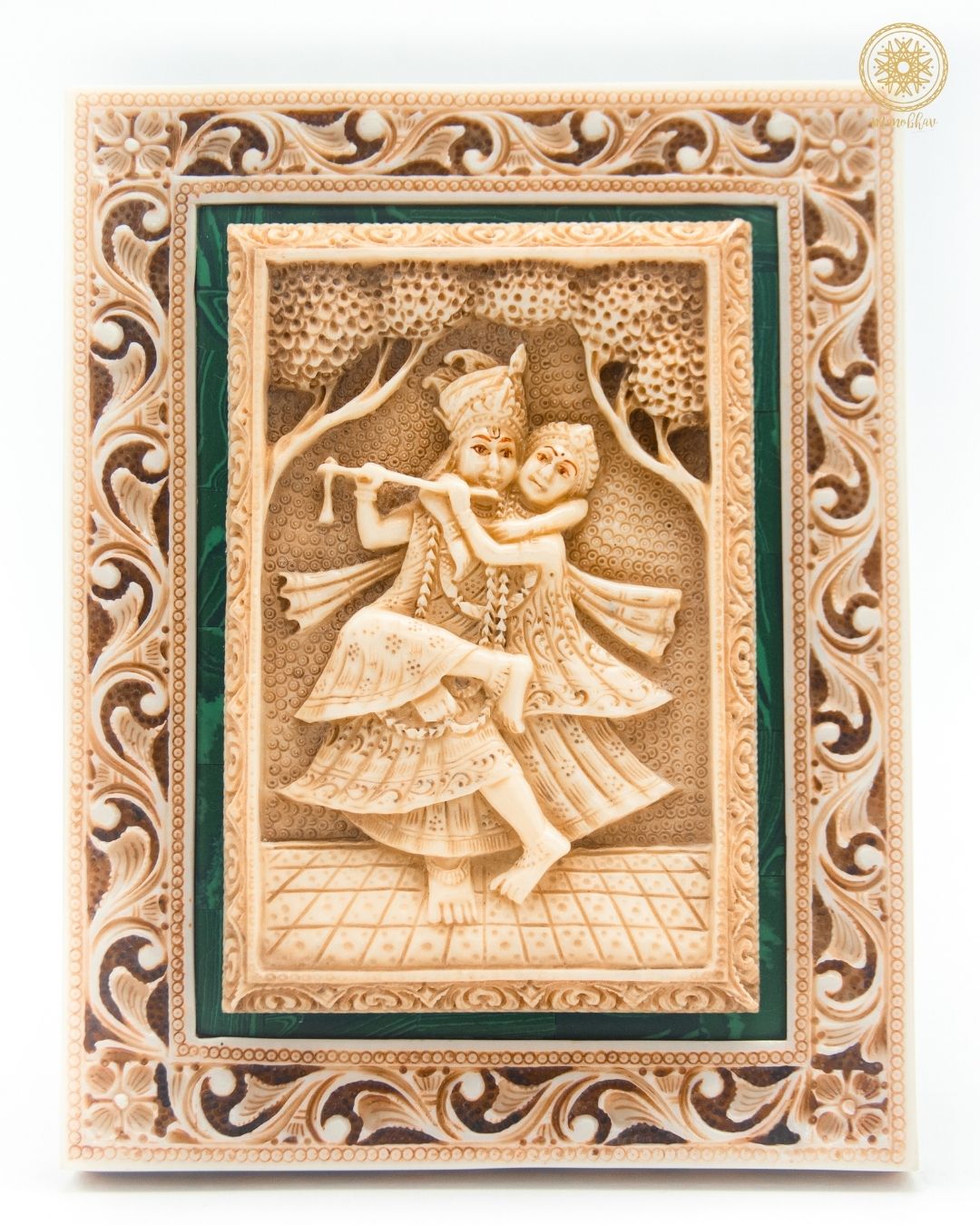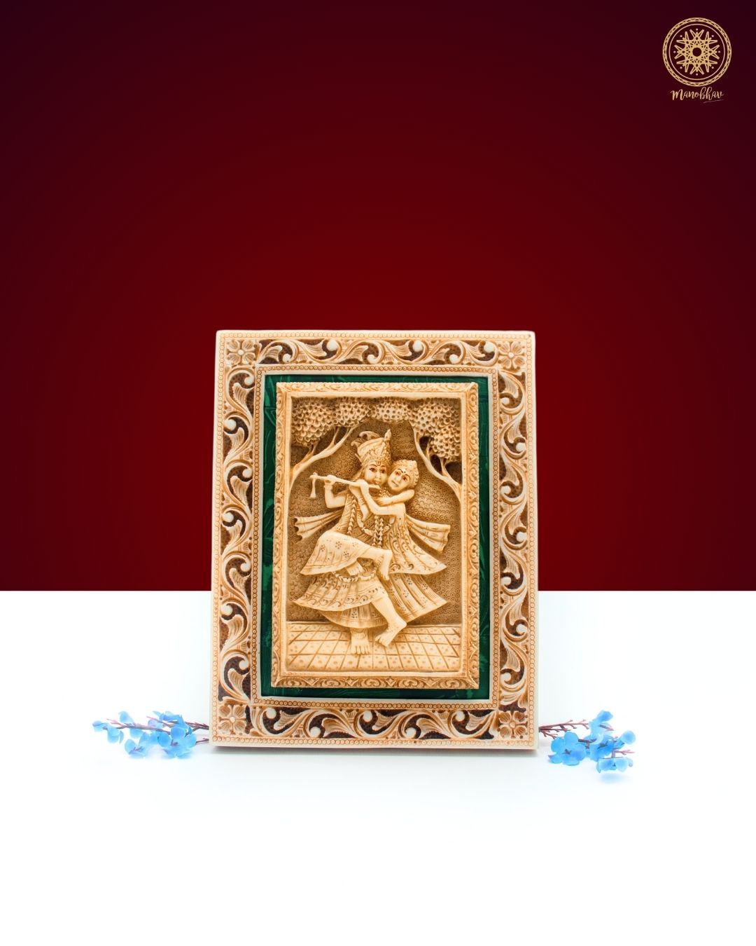 Bring the divine presence of Radha Krishna into your home in this wonderful wall hanging frame. It is well crafted, made with fine detailing and exquisite malachite inlay work that gives an elegant look to your decor. This eternal love tale of Radha and Krishna on this resin with malachite inlay-work frame makes it fit for any spiritually serene corner of your home. Whether used as a way to display wall art decor, or as the focal point of your living room, this frame shows class and devotion. A versatile frame that supports and complements gallery frames, its touch adds tradition and artistry to that special place in your home. This beautiful piece of home decor of Radha Krishna is perfect to gift someone at festival times, weddings, or housewarming ceremonies.