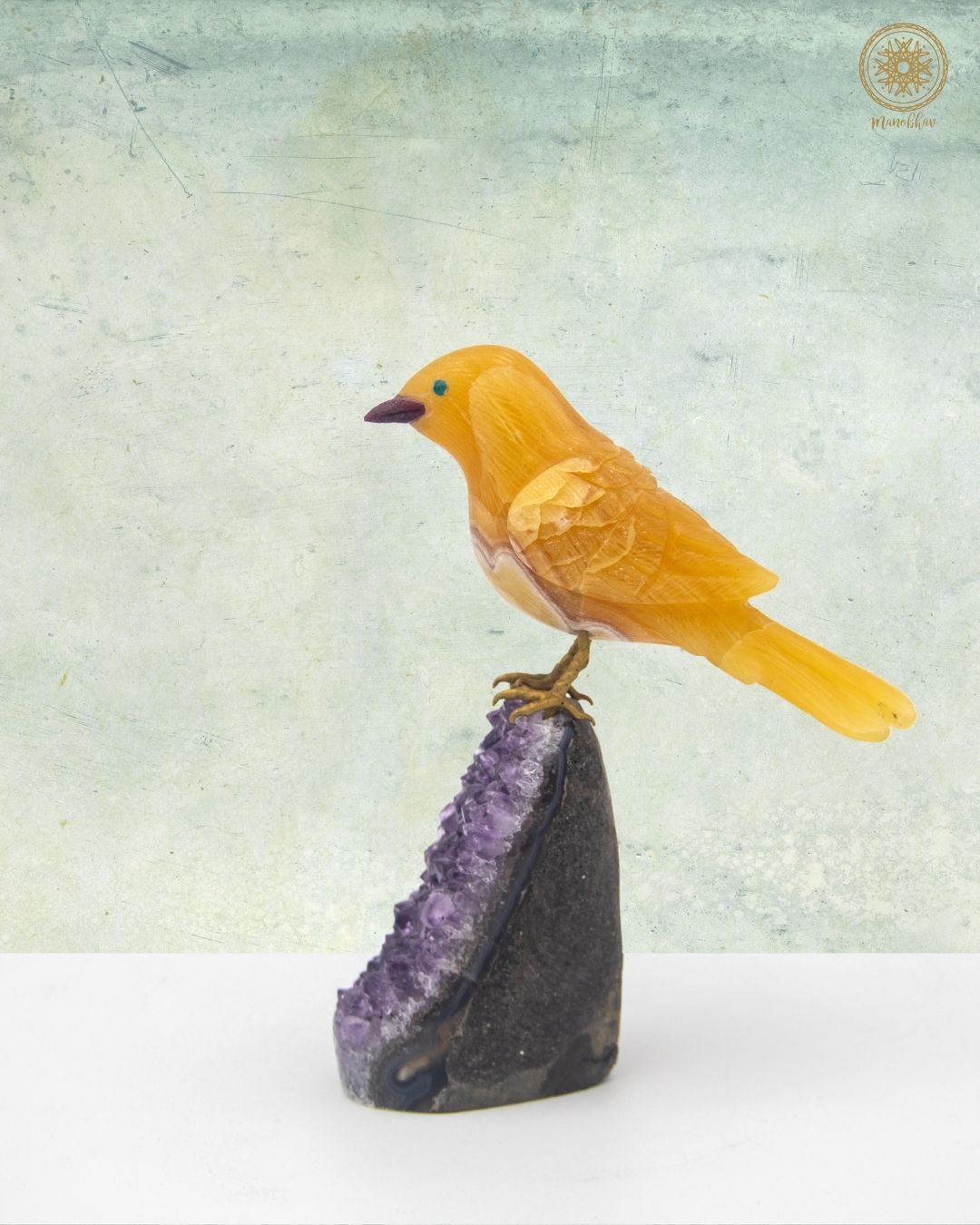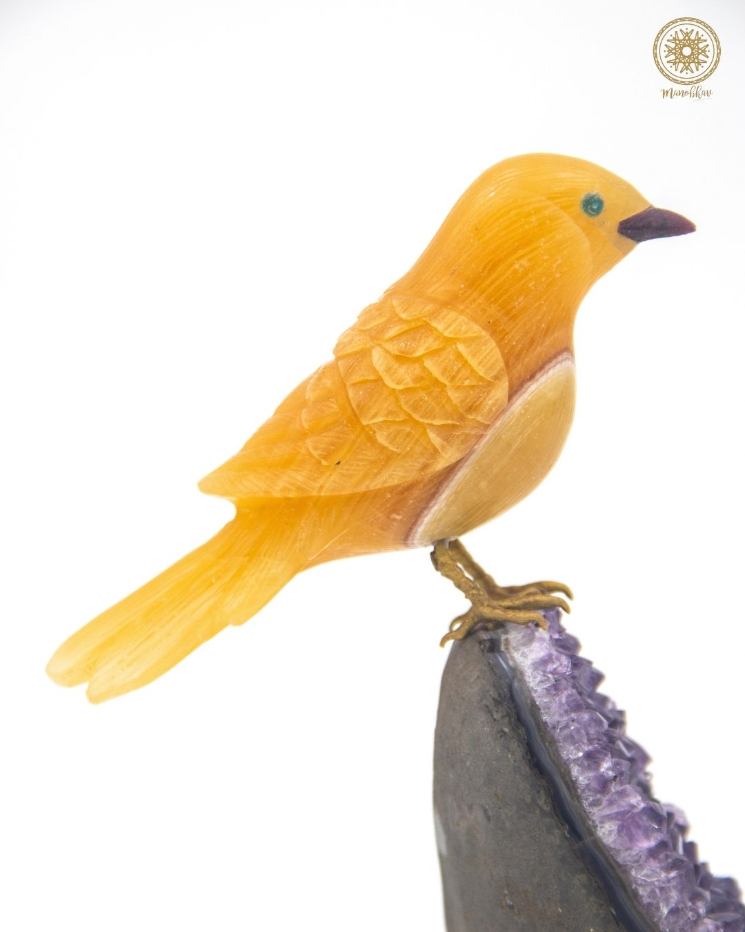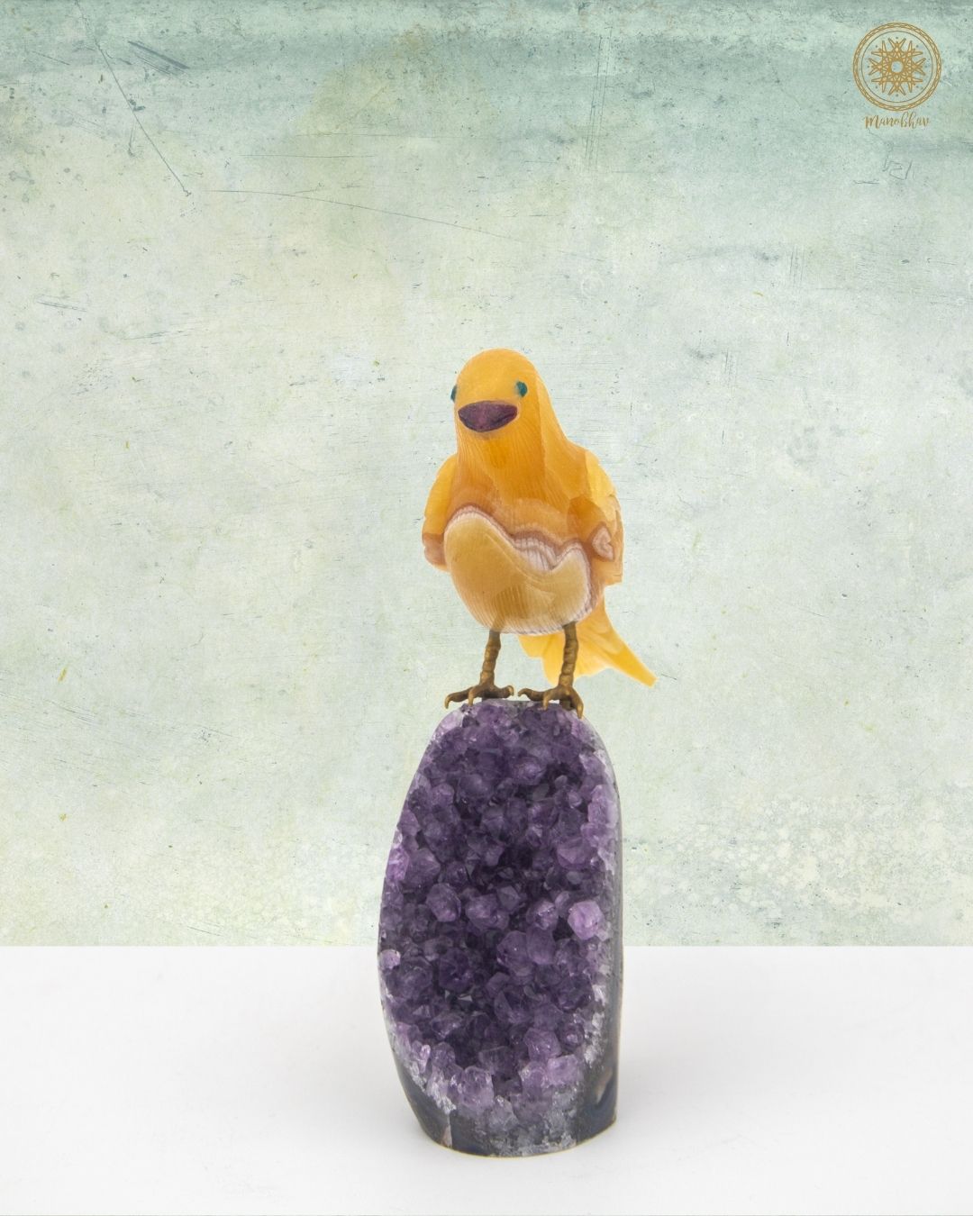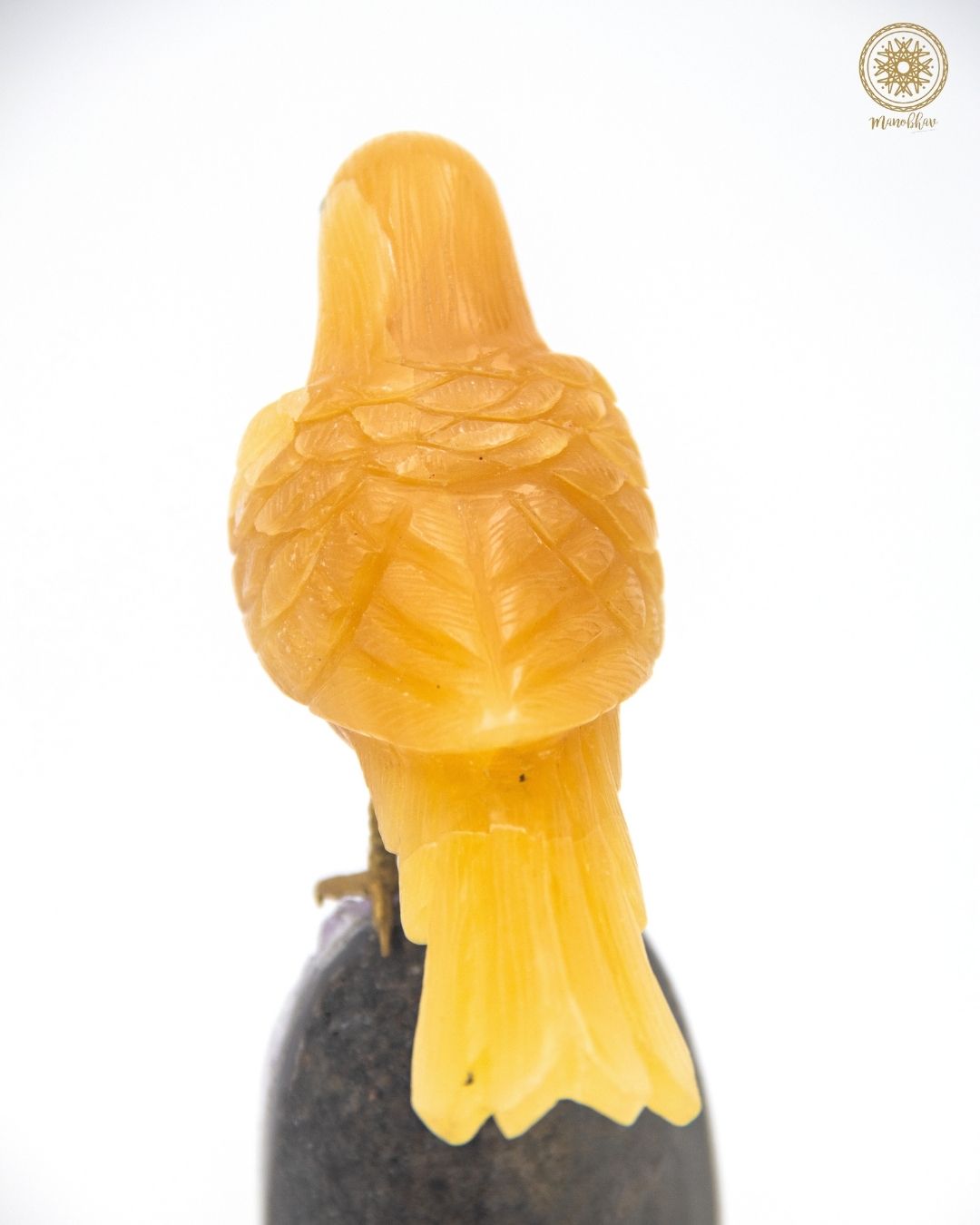 The Unique Yellow Quartz Bird Statue is perfect representation of the nature and the art. Made from pure yellow quartz stone with base of amethyst, this piece of gemstone art depicts a bird in motion, beautifully carved from every angle. Yellow quartz is comfort and inspires emotional healing and clarity thus the statue of a bird connects perfectly in any decor suited to promote peace. This bird sculpture is perfect for placing in any part of the house and it always lightens the space. The statue is so patiently carved that one can imagine how the bird looks like with all its beautifully drawn feathers and curves. This hand carved gemstone art piece is also perfect gift item for bird lovers and for those who enjoy crystals and unique decor.