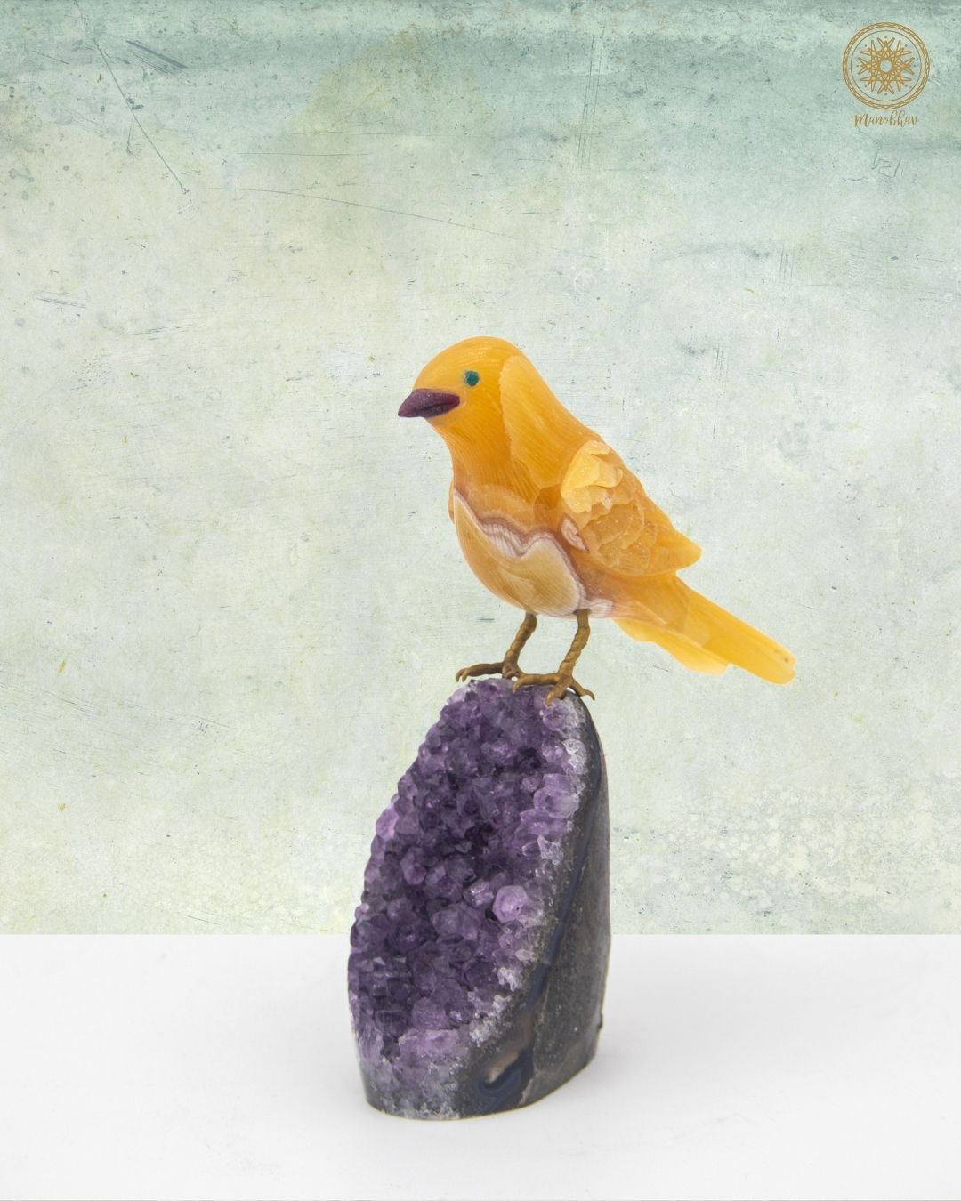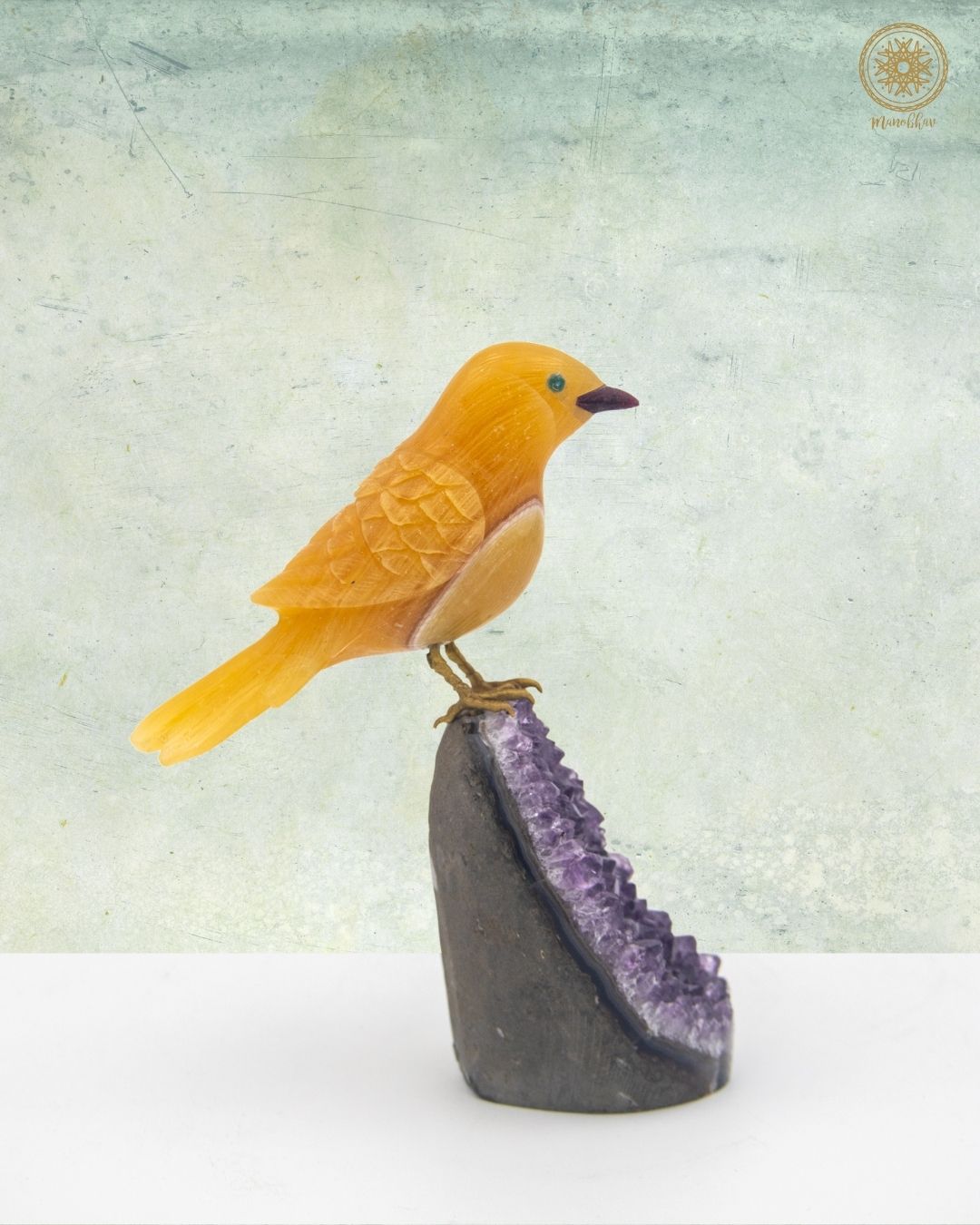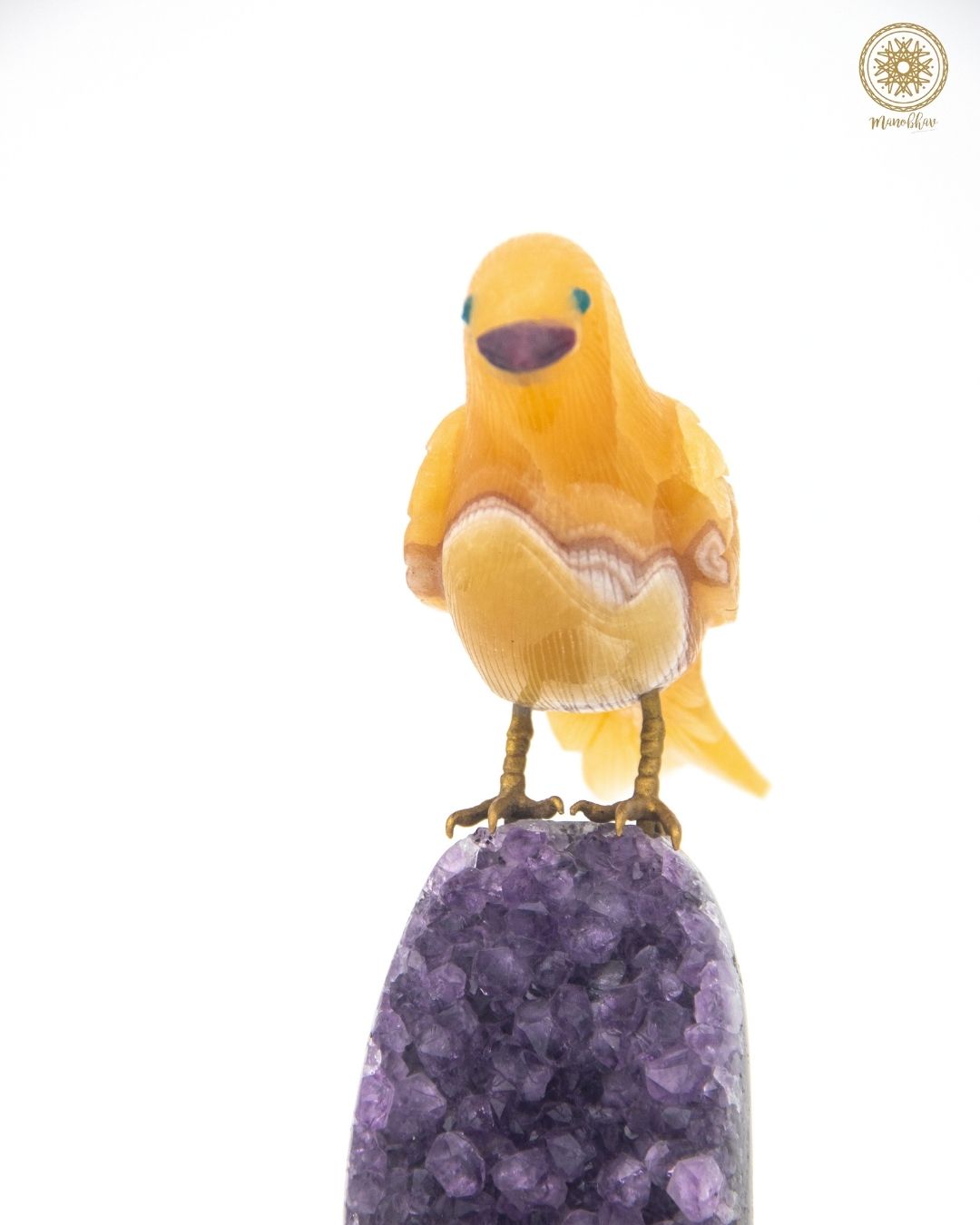 The Unique Yellow Quartz Bird Statue is perfect representation of the nature and the art. Made from pure yellow quartz stone with base of amethyst, this piece of gemstone art depicts a bird in motion, beautifully carved from every angle. Yellow quartz is comfort and inspires emotional healing and clarity thus the statue of a bird connects perfectly in any decor suited to promote peace. This bird sculpture is perfect for placing in any part of the house and it always lightens the space. The statue is so patiently carved that one can imagine how the bird looks like with all its beautifully drawn feathers and curves. This hand carved gemstone art piece is also perfect gift item for bird lovers and for those who enjoy crystals and unique decor.