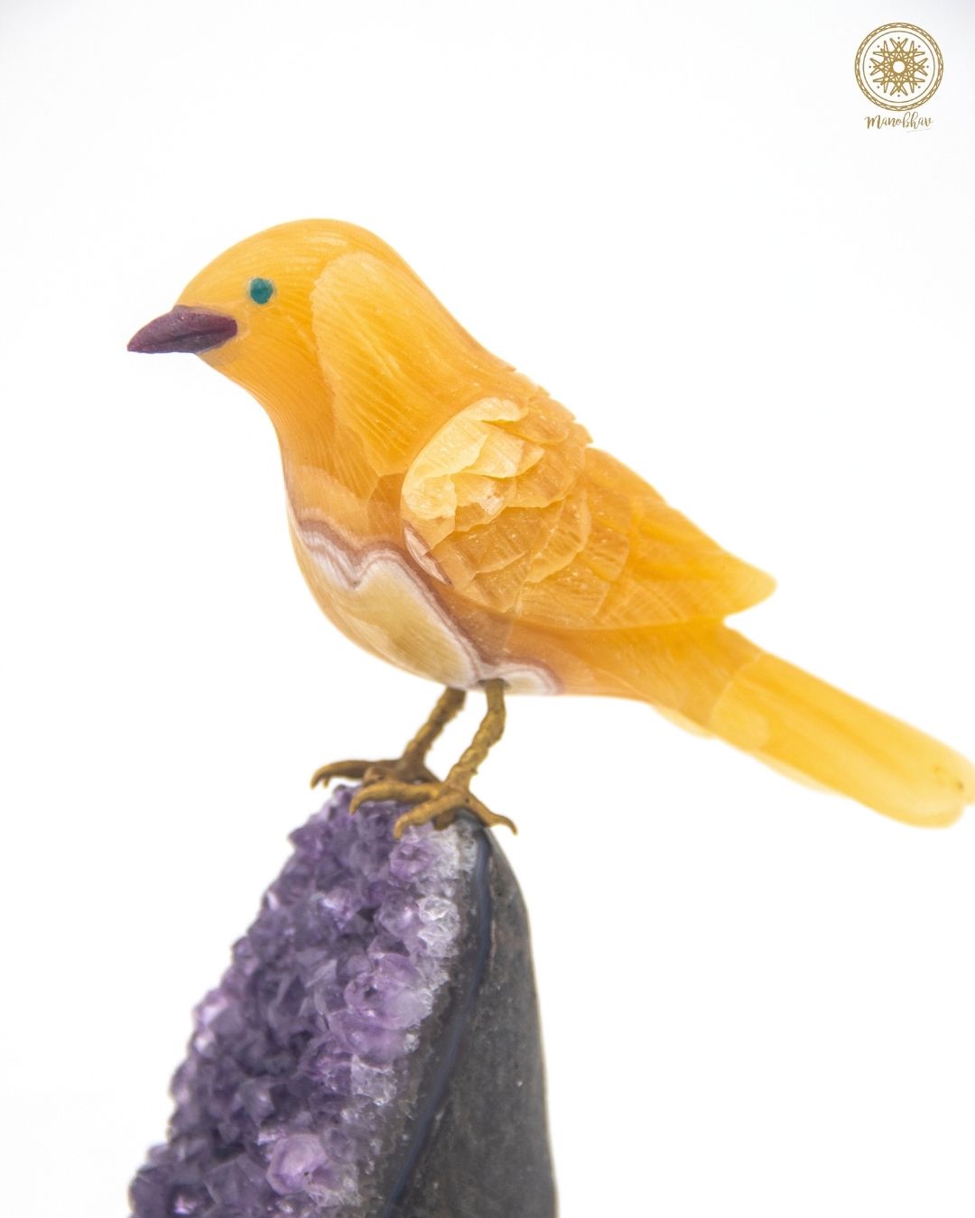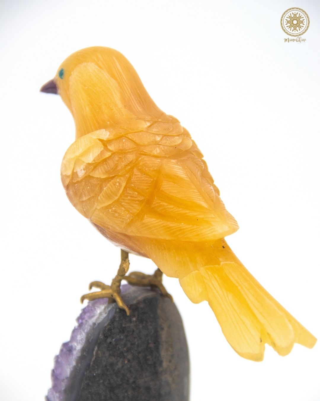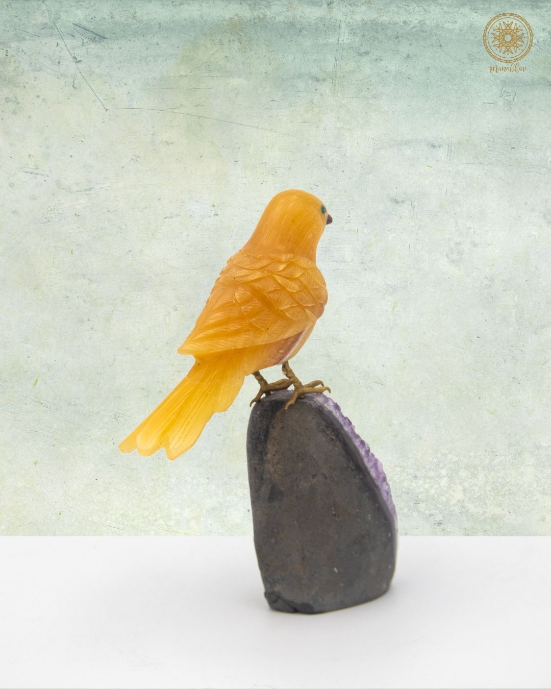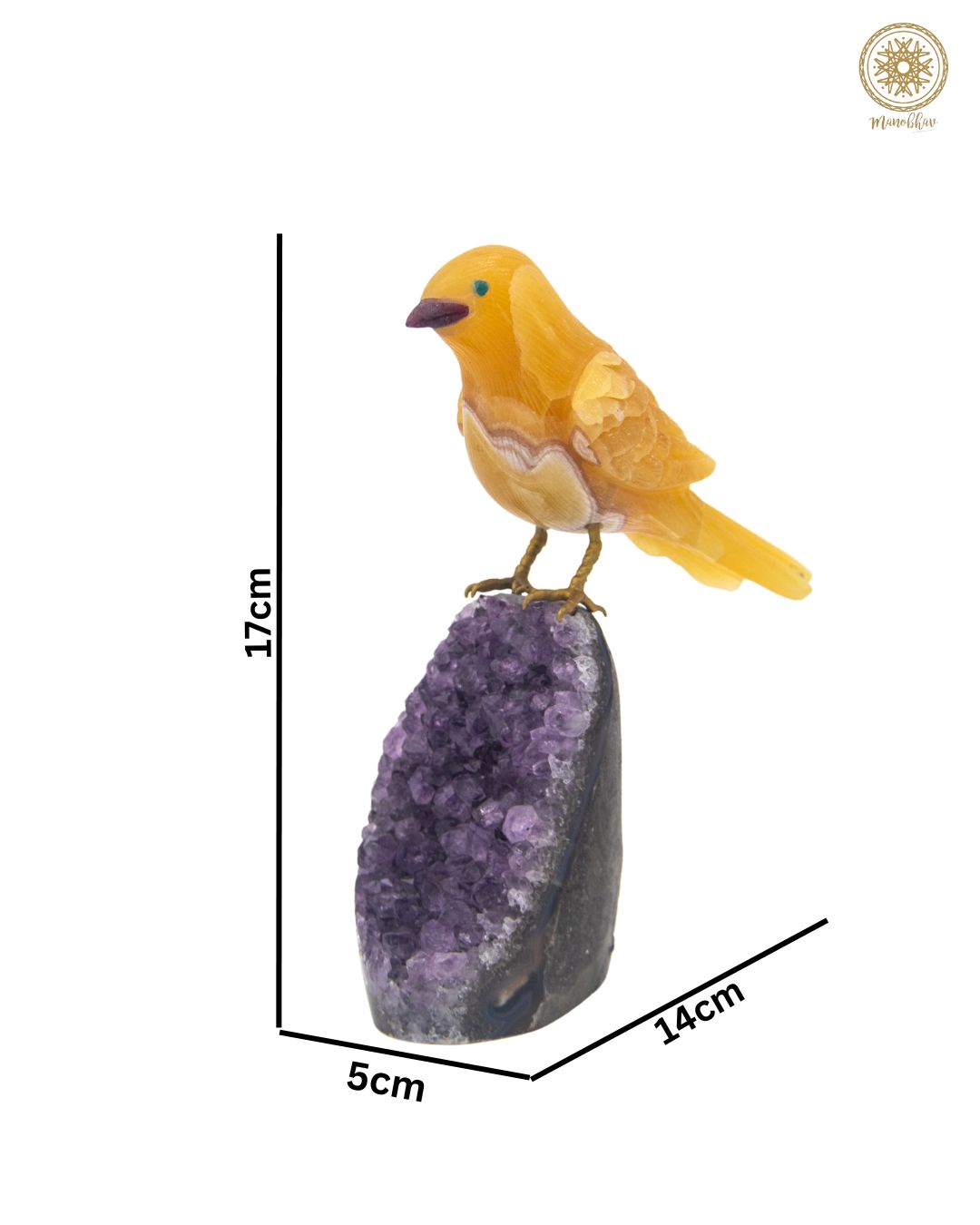 The Unique Yellow Quartz Bird Statue is perfect representation of the nature and the art. Made from pure yellow quartz stone with base of amethyst, this piece of gemstone art depicts a bird in motion, beautifully carved from every angle. Yellow quartz is comfort and inspires emotional healing and clarity thus the statue of a bird connects perfectly in any decor suited to promote peace. This bird sculpture is perfect for placing in any part of the house and it always lightens the space. The statue is so patiently carved that one can imagine how the bird looks like with all its beautifully drawn feathers and curves. This hand carved gemstone art piece is also perfect gift item for bird lovers and for those who enjoy crystals and unique decor.
